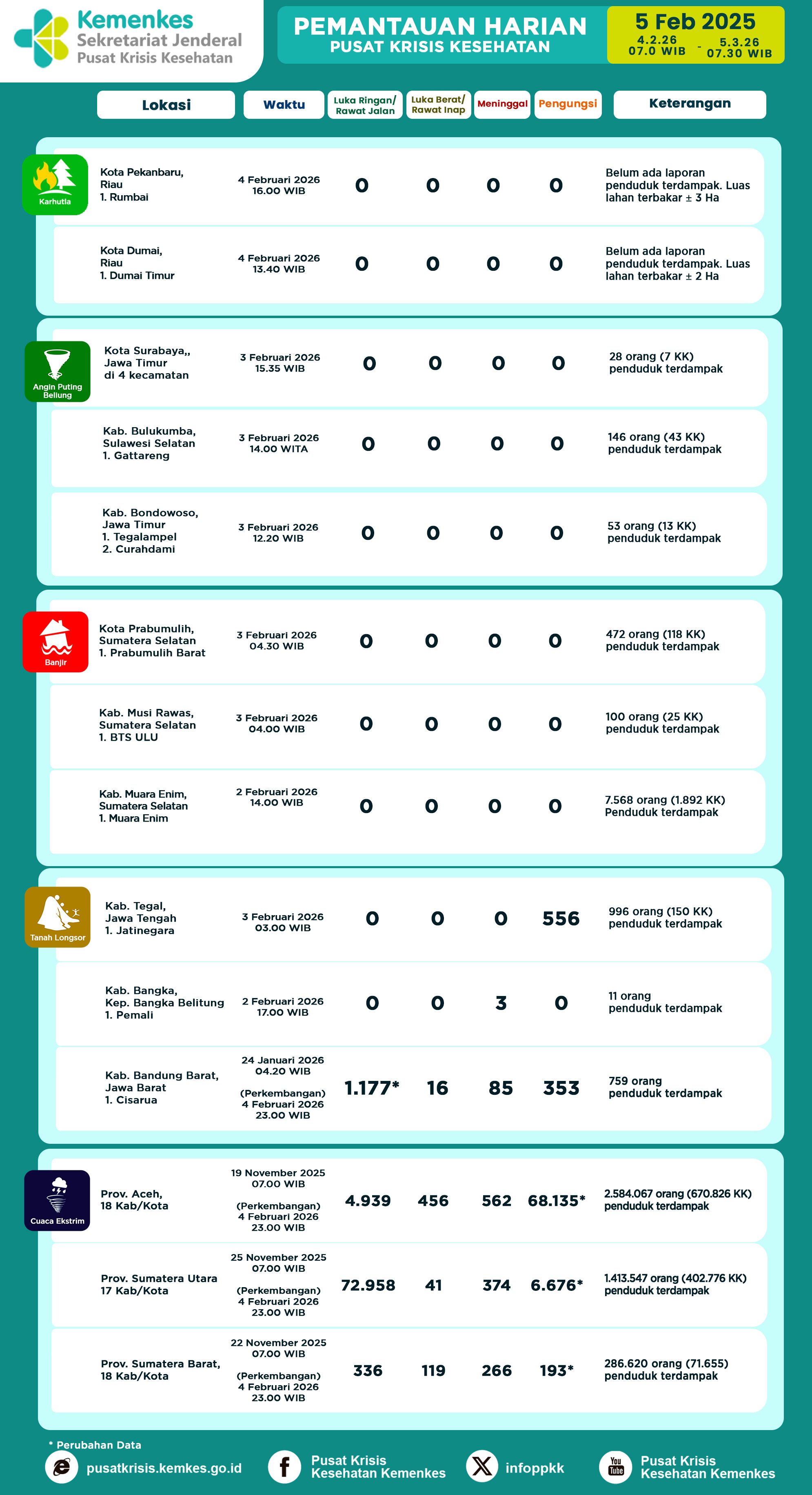 Disini anda dapat mengunduh Infografis Pemantauan Harian Kejadian Krisis Kesehatan Pusat Krisis Kesehatan Kementerian Kesehatan, tanggal 01 April 2022 pukul 07.30. Terdapat laporan kejadian 2 banjir, 3 angin puting beliung, 1 gempa bumi, dan 2 karhutla