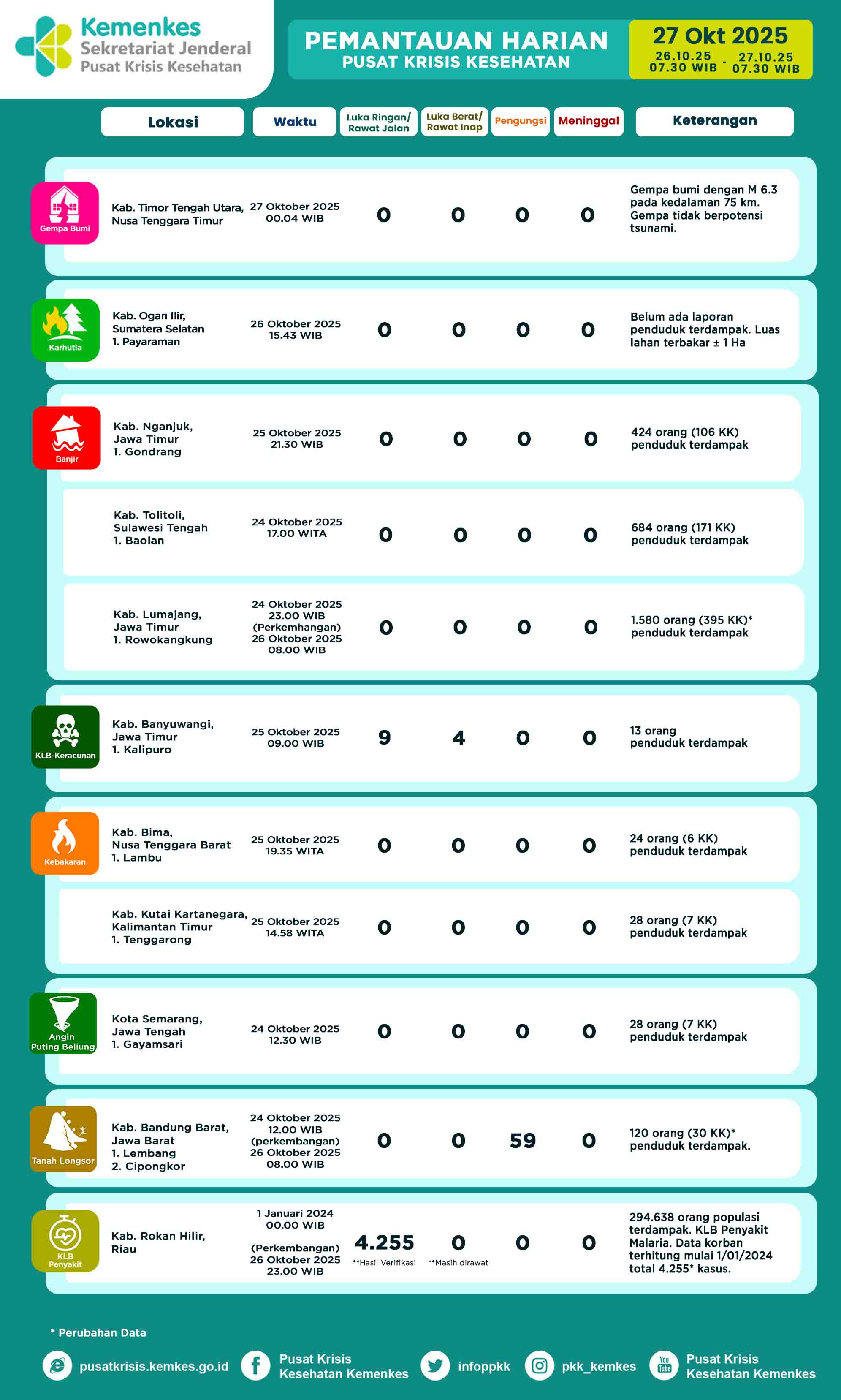 Disini anda dapat mengunduh Laporan Pemantauan Harian Kejadian Krisis Kesehatan Pusat Krisis Kesehatan Kementerian Kesehatan tanggal 31 Mei 2024 pukul 07.30 WIB hingga 01 Juni 2024 pukul 07.30 WIB. Terdapat 12 laporan kejadian bencana: 3 Banjir, 2 Gempa Bumi, 2 Tanah Longsor, 2 Erupsi Gunung Api, 2 Banjir Bandang, 1 Keracunan.