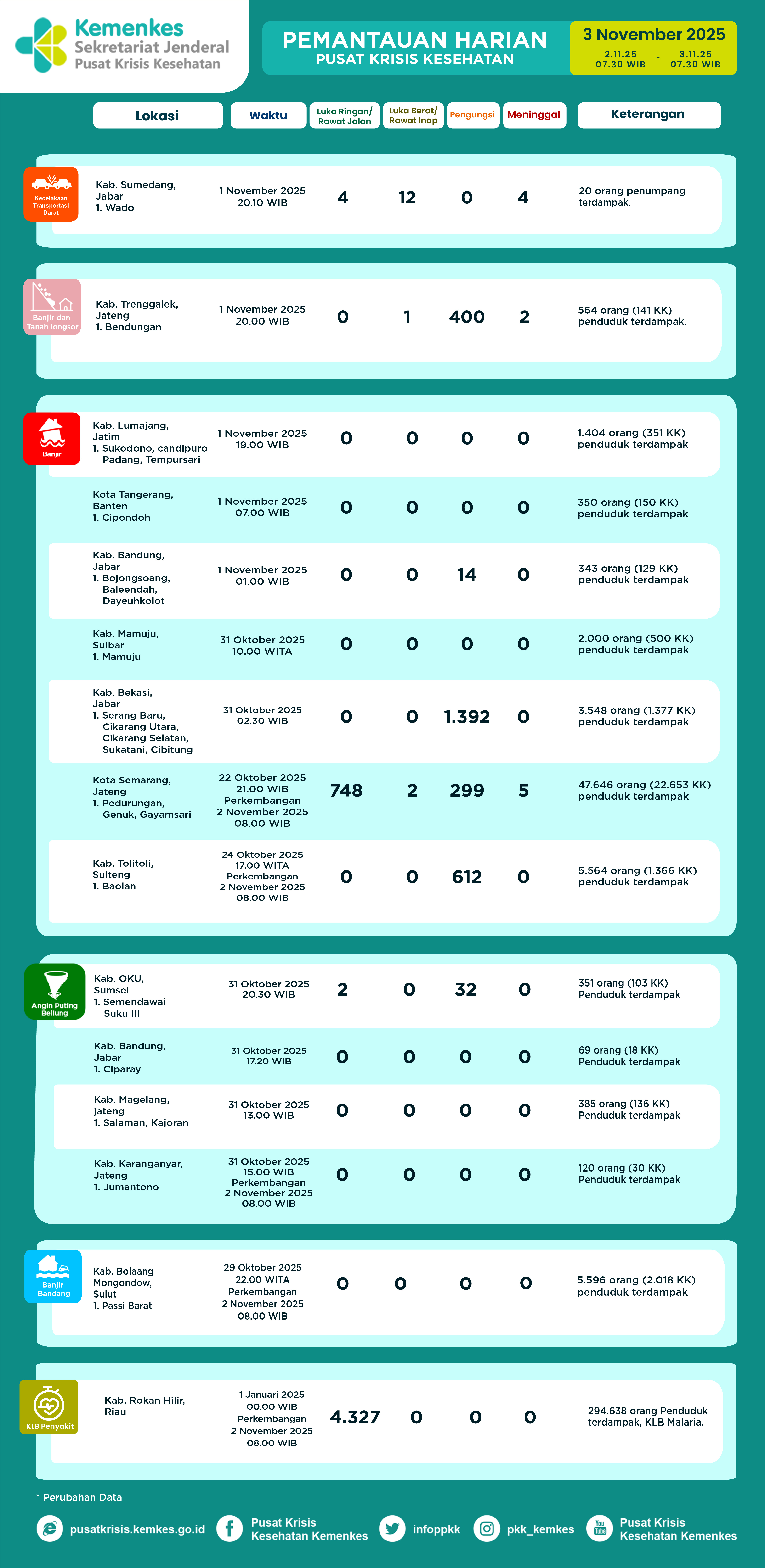 Disini anda dapat mengunduh Laporan Pemantauan Harian Kejadian Krisis Kesehatan Pusat Krisis Kesehatan Kementerian Kesehatan tanggal 05 Desember 2023 pukul 07.30 WIB. Terdapat 6 laporan kejadian: 2 Erupsi Gunung Api, 2 Banjir, 1 Angin Puting Beliung dan 1 Tanah Longsor.