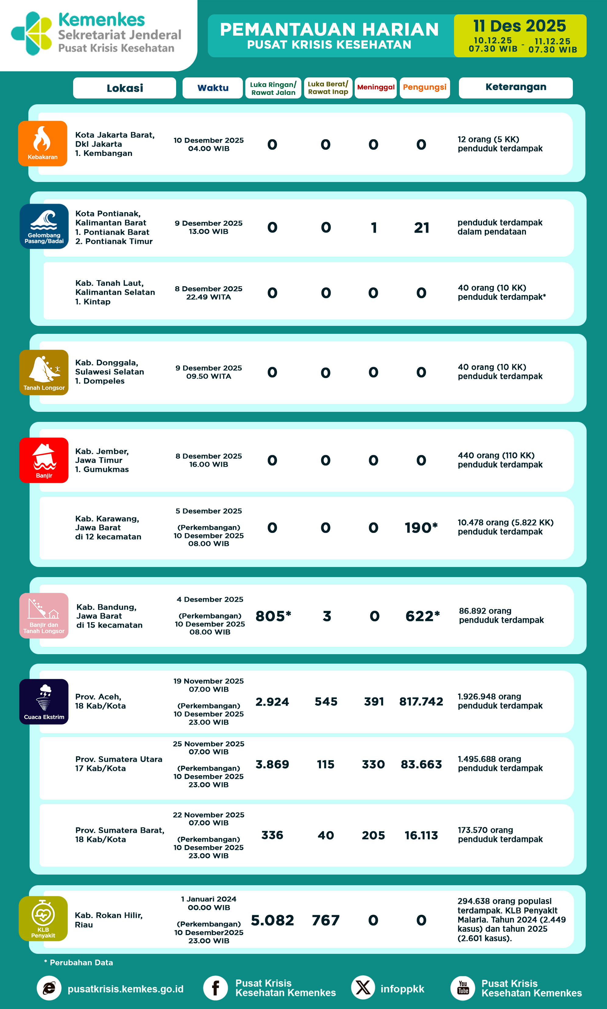 Disini anda dapat mengunduh Infografis Pemantauan Harian Kejadian Krisis Kesehatan Pusat Krisis Kesehatan Kementerian Kesehatan tanggal 06 Februari 2023 pukul 07.30 WIB. Terdapat laporan kejadian: 2 Erupsi Gunung Api, 2 Banjir, 1 Kebakaran dan 2 Angin Puting Beliung