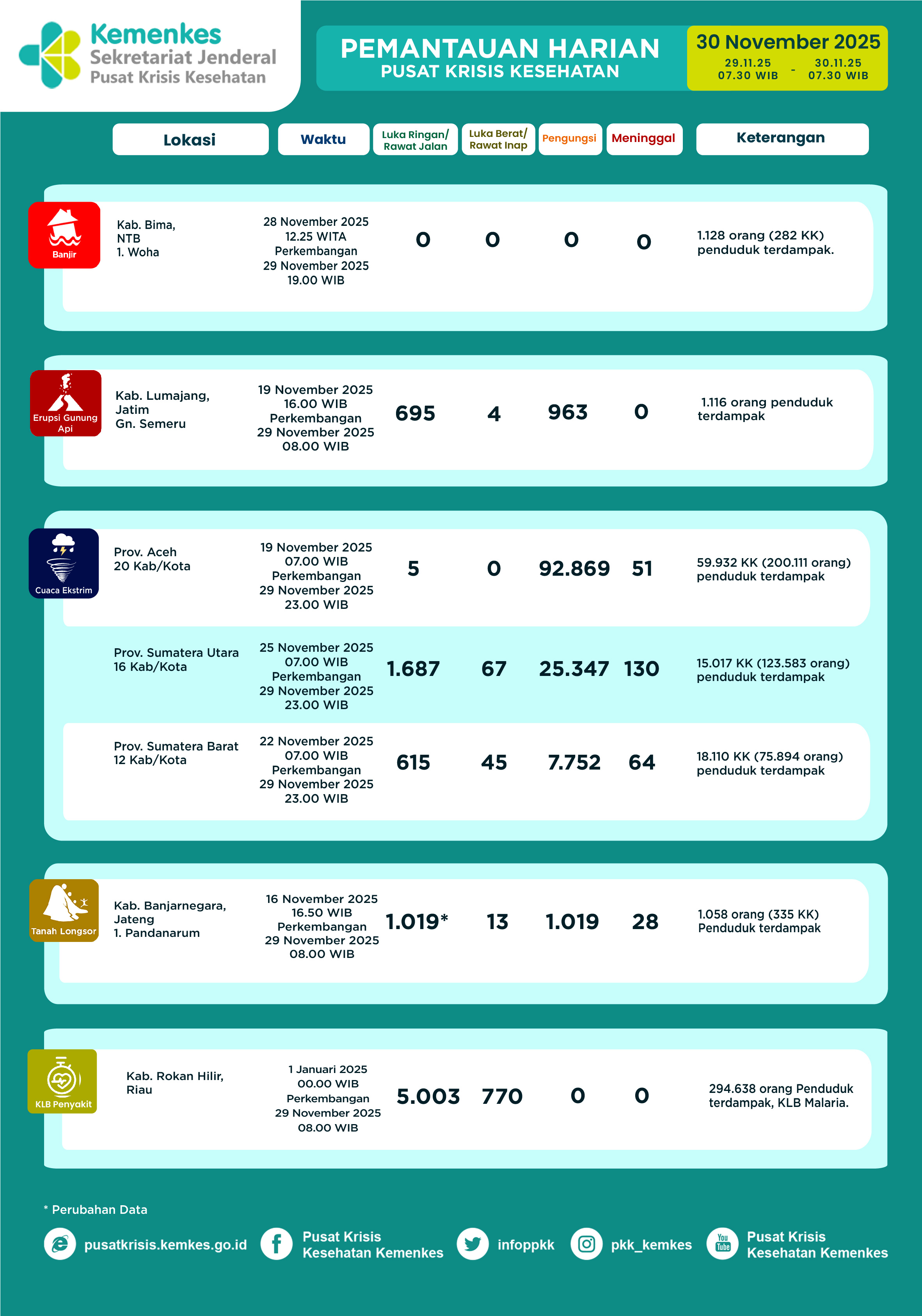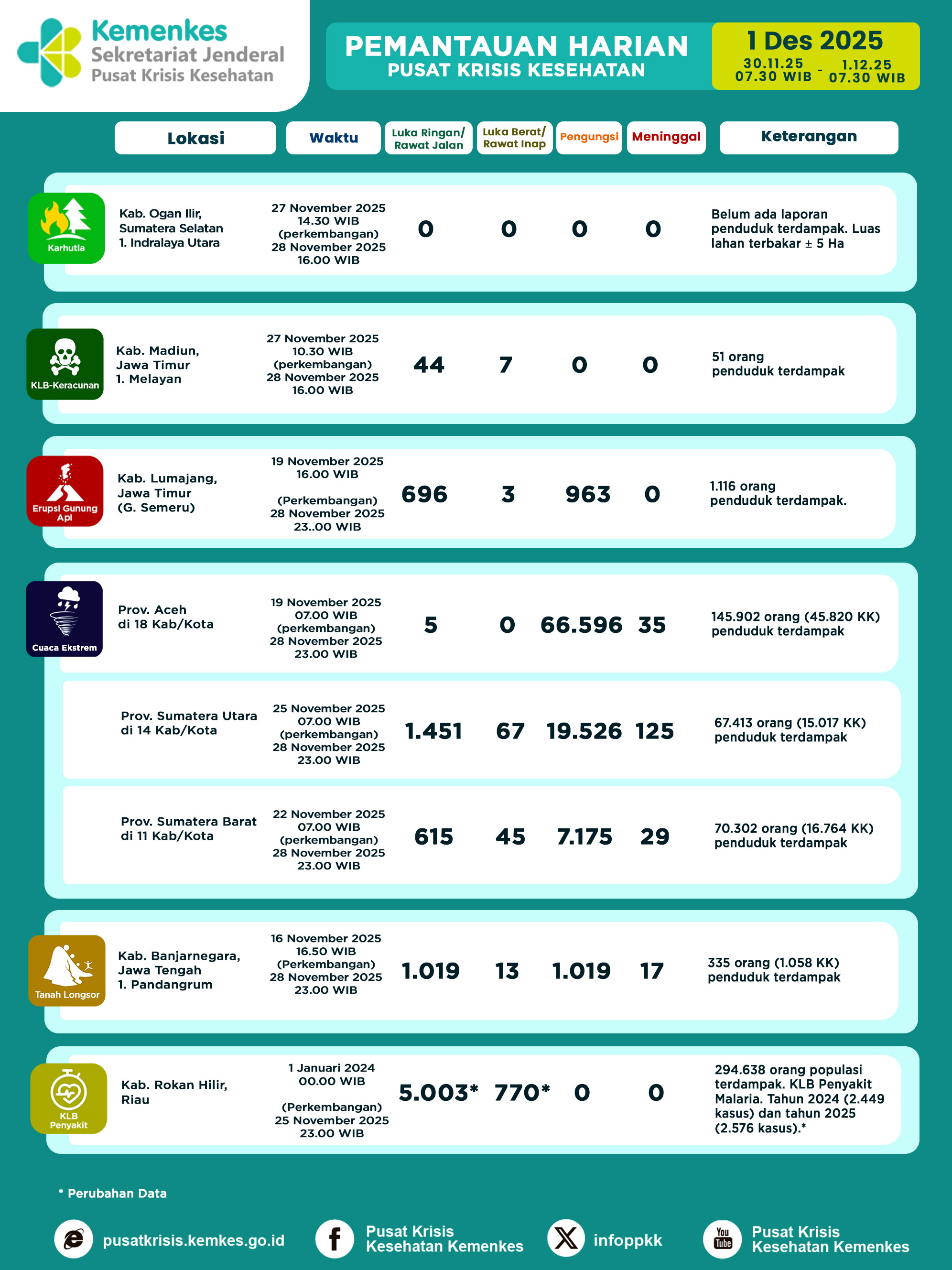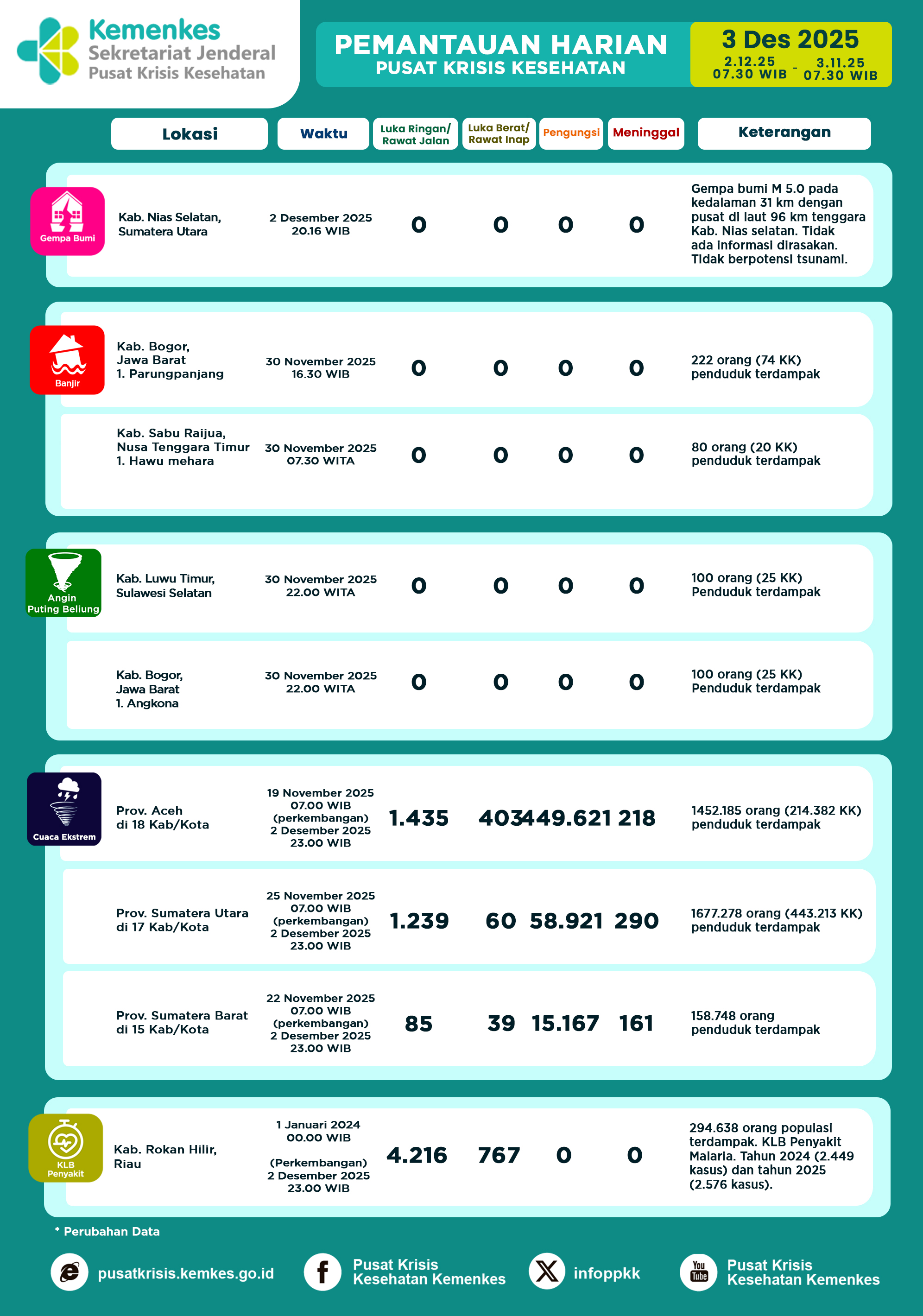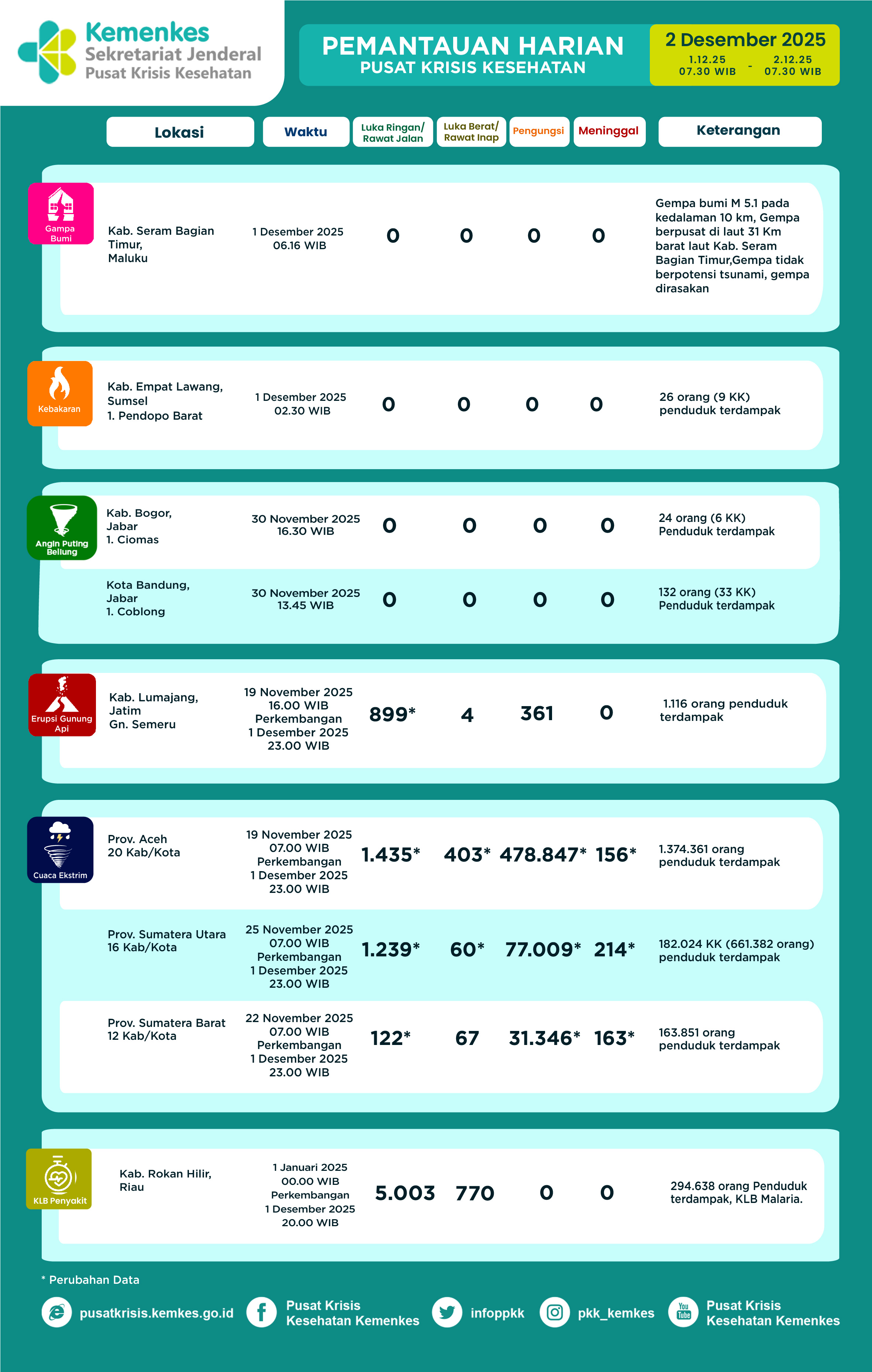 Disini anda dapat mengunduh Laporan Pemantauan Harian Kejadian Krisis Kesehatan Pusat Krisis Kesehatan Kementerian Kesehatan tanggal 05 Januari 2024 pukul 07.30 WIB hingga 06 Januari 2024 pukul 07.30 WIB. Terdapat 13 laporan kejadian: 2 Gempa bumi, 1 Kebakaran, 3 Angin Puting Beliung, 4 Banjir, 1 Kecelakaan Transportasi Darat, 1 Erupsi Gunung Api dan 1 Banjir dan Tanah Longsor.