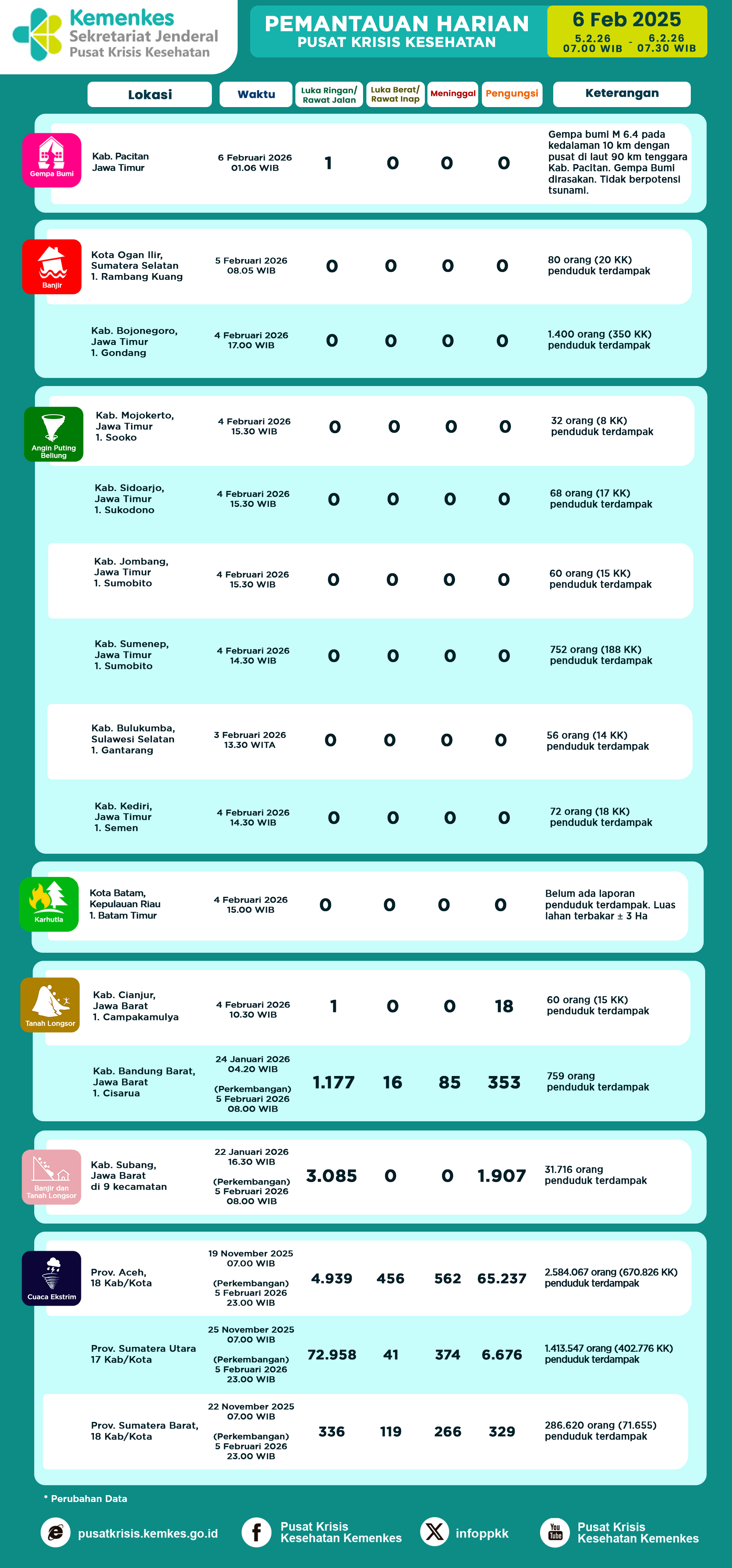 Di sini anda dapat melihat dan mengunduh laporan Pemantauan Harian Pusat Krisis Kesehatan Kementerian Kesehatan Tanggal 9 Juli 2025 pukul 07.30 WIB hingga 10 Juli 2025 pukul 07.30 WIB
