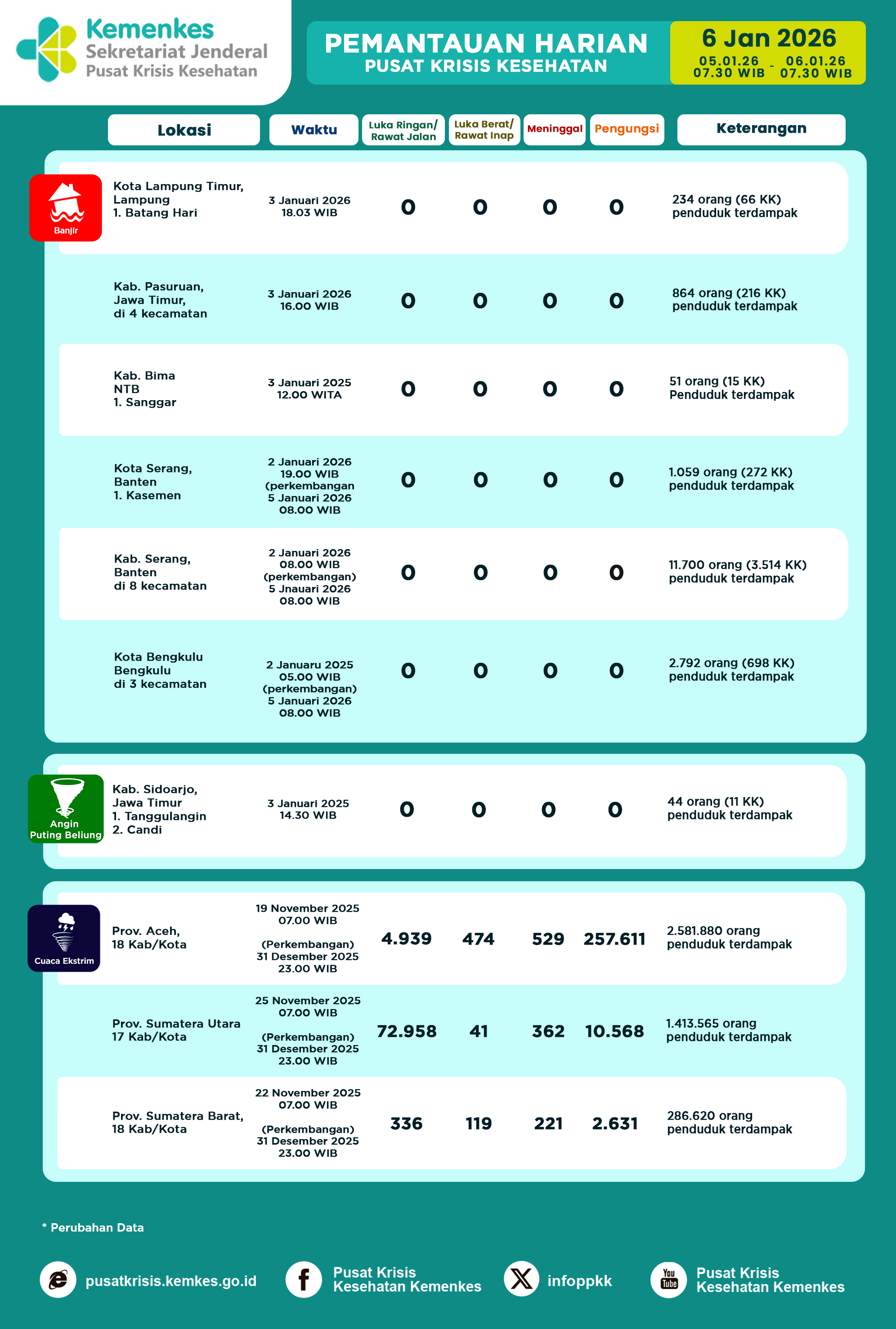 Disini anda dapat mengunduh Laporan Pemantauan Harian Kejadian Krisis Kesehatan Pusat Krisis Kesehatan Kementerian Kesehatan tanggal 11 Agustus 2024 pukul 07.30 WIB hingga 12 Agustus 2024 pukul 07.30 WIB. Terdapat 11 laporan kejadian bencana: 1 Angin Puting Beliung, 6 Banjir, 3 Karhutla, dan 1 Kekeringan.