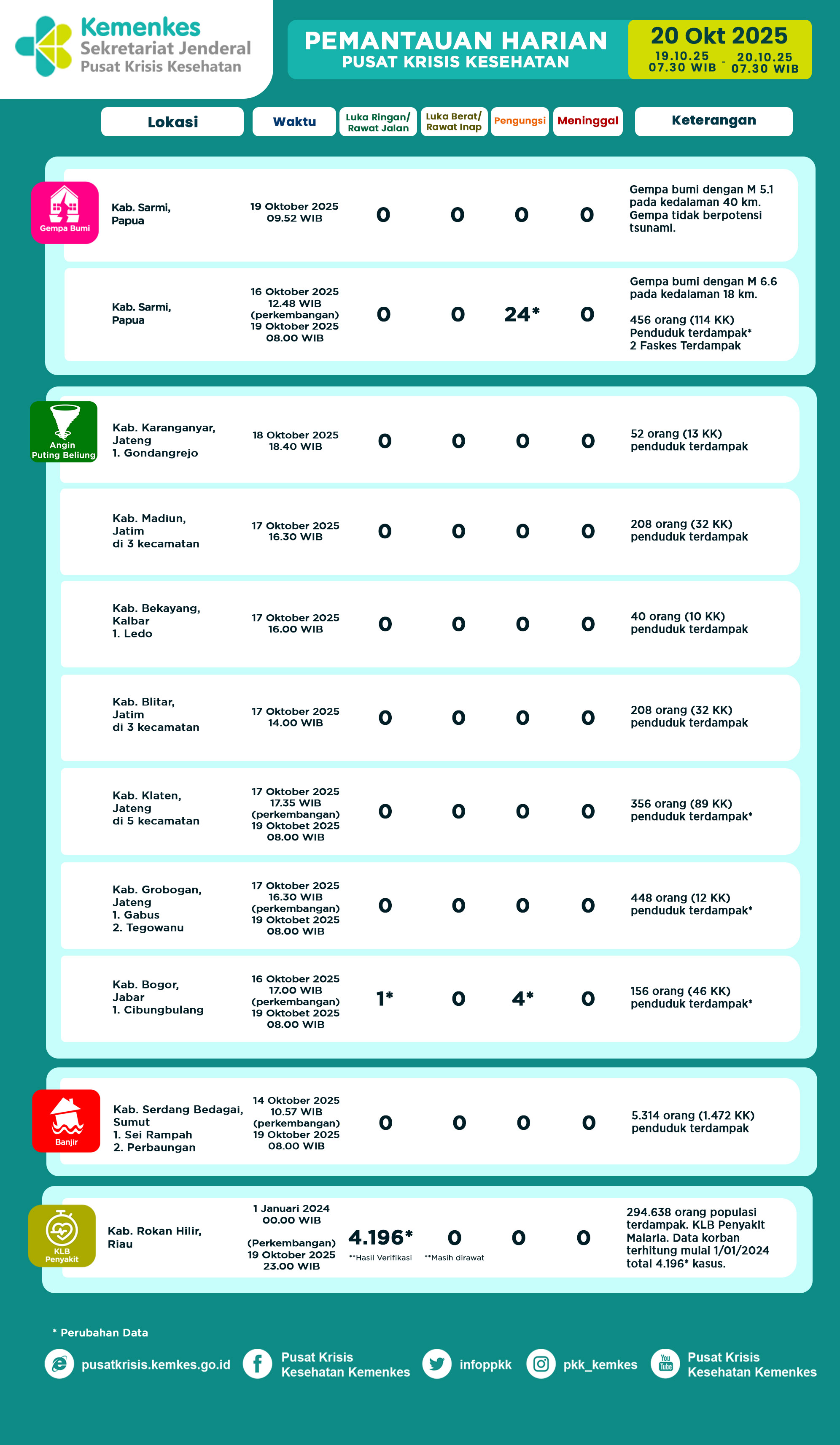 Disini anda dapat mengunduh Laporan Pemantauan Harian Kejadian Krisis Kesehatan Pusat Krisis Kesehatan Kementerian Kesehatan tanggal 12 April 2024 pukul 07.30 WIB hingga 13 April 2024 pukul 07.30 WIB. Terdapat 7 laporan kejadian bencana: 4 Banjir, 1 Tanah Longsor, 1 Kebakaran dan 1 Kebakaran Hutan dan Lahan.