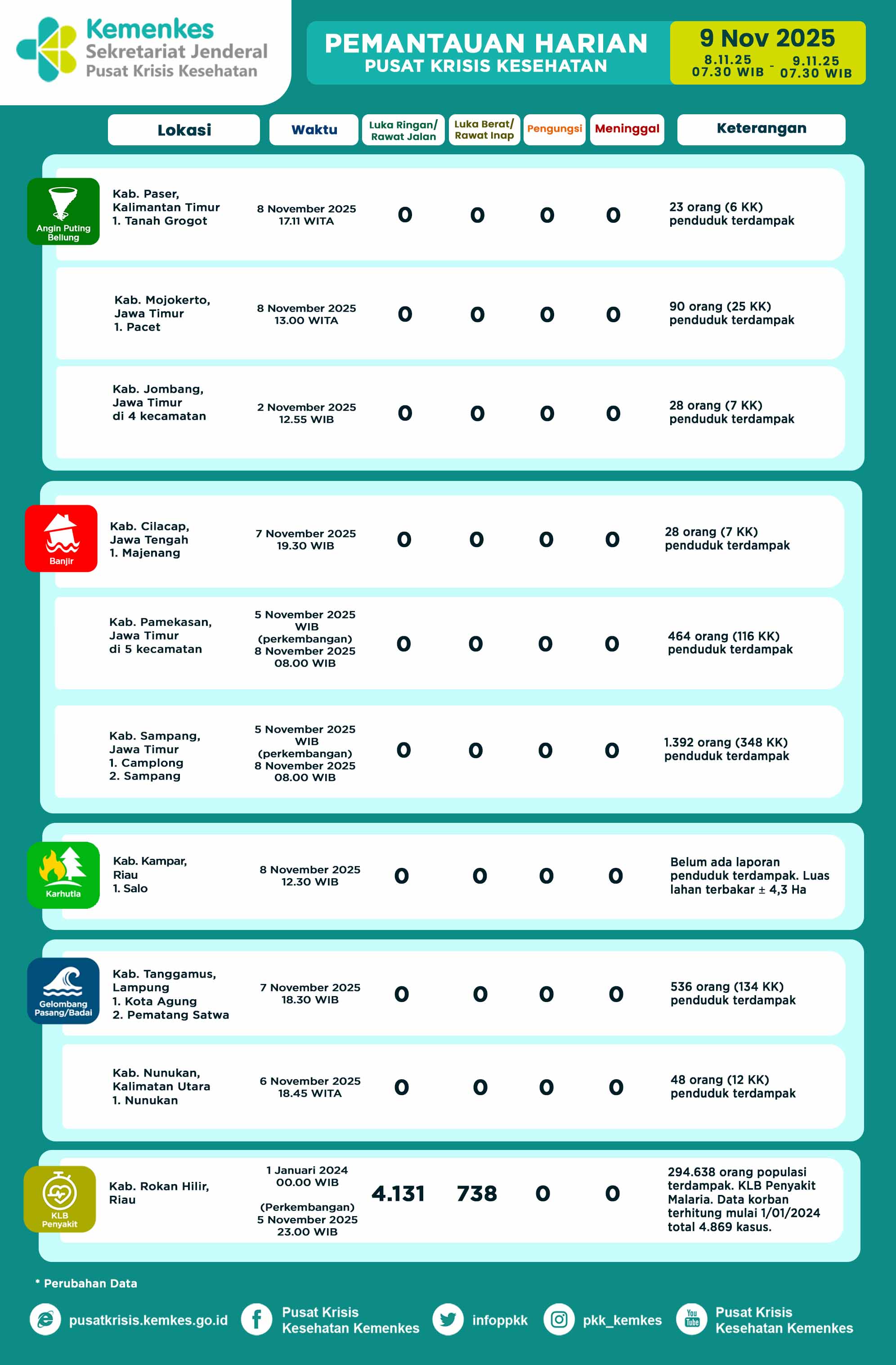 Disini anda dapat mengunduh Laporan Pemantauan Harian Kejadian Krisis Kesehatan Pusat Krisis Kesehatan Kementerian Kesehatan tanggal 13 Februari 2024 pukul 07.30 WIB hingga 14 Februari 2024 pukul 07.30 WIB. Terdapat 9 kejadian bencana: 4 Banjir, 2 Gempa Bumi, 2 Anging Puting Beliung dan 1 Kebakaran.