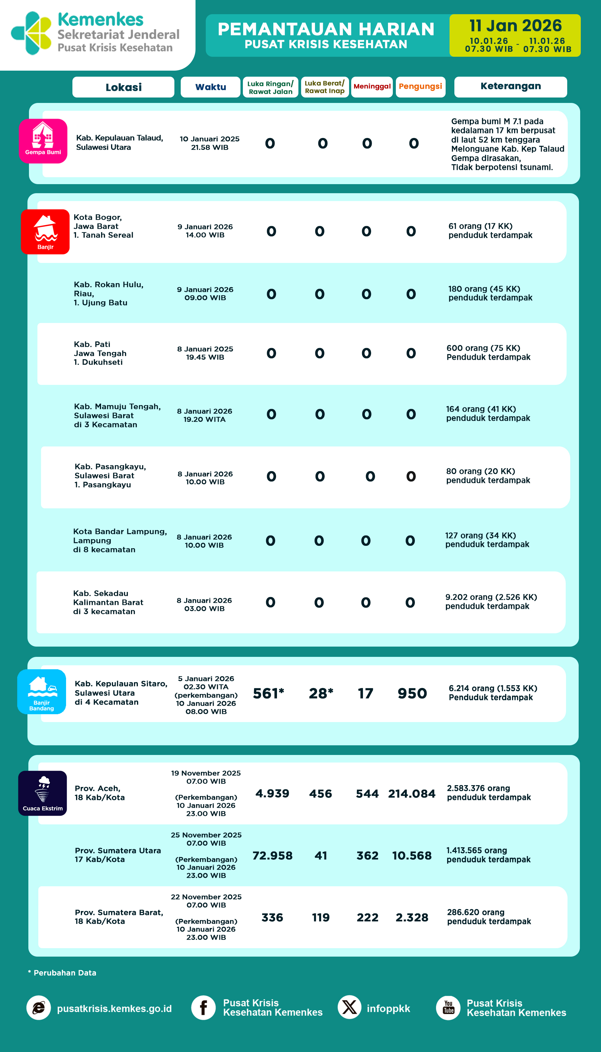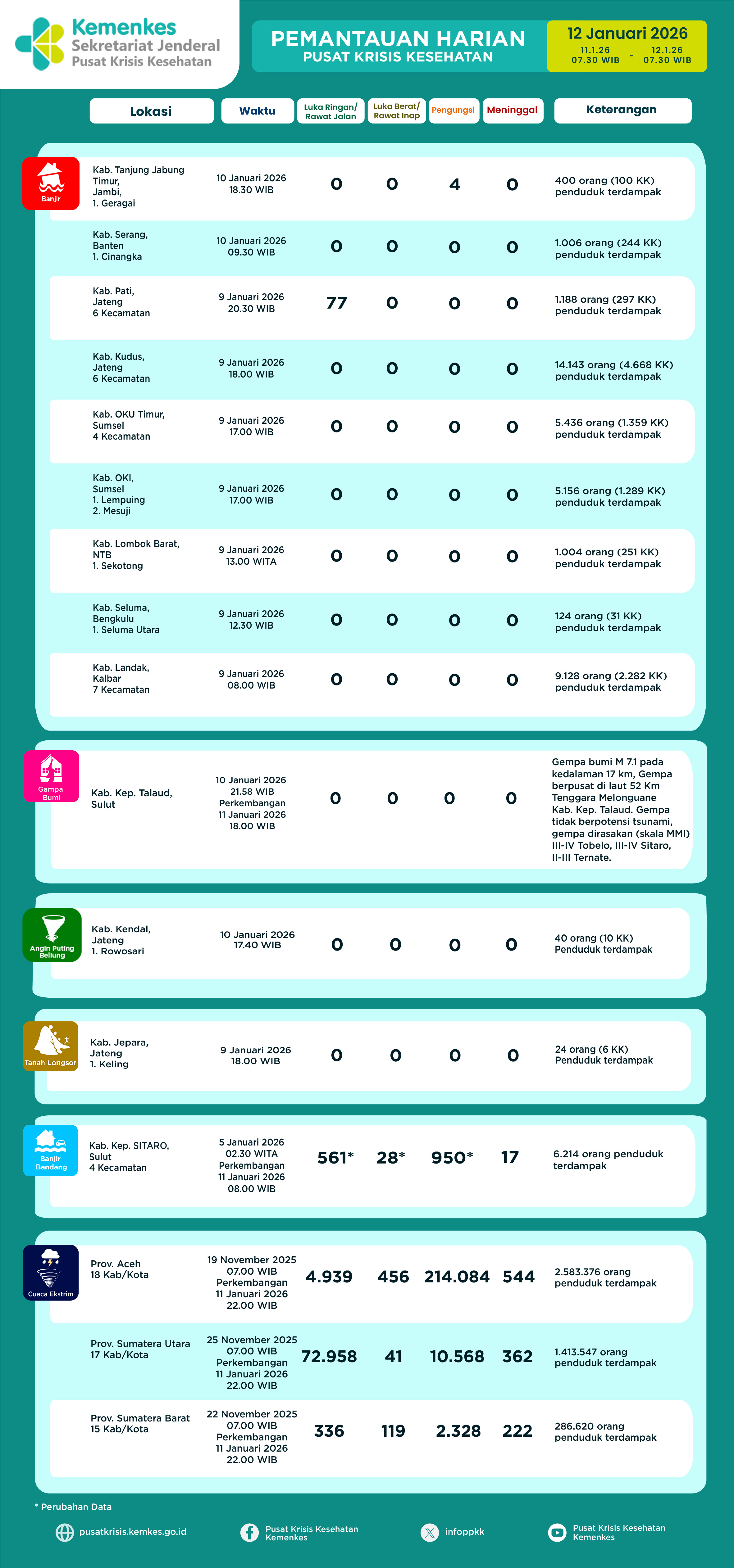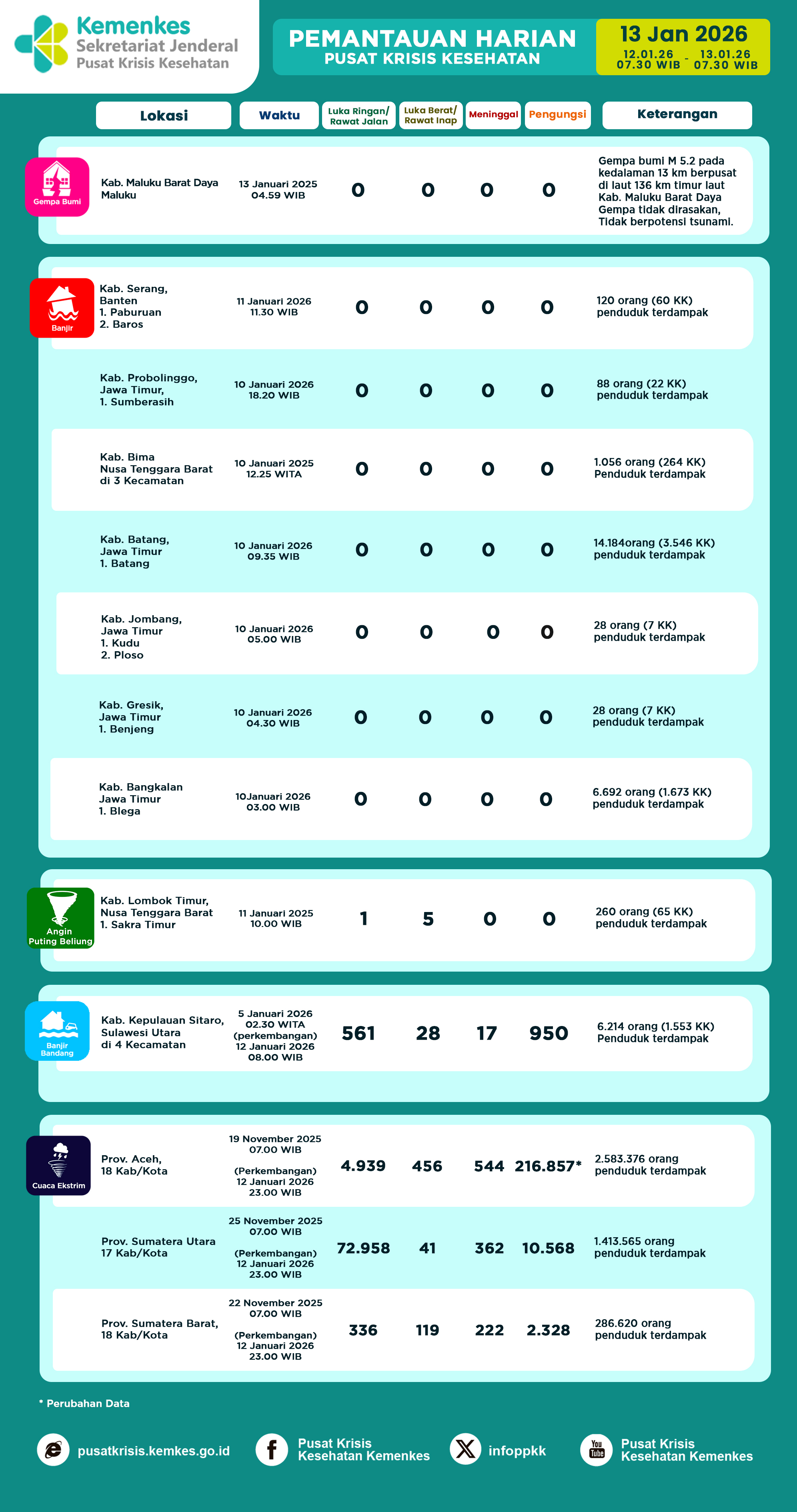 Disini anda dapat mengunduh Laporan Pemantauan Harian Kejadian Krisis Kesehatan Pusat Krisis Kesehatan Kementerian Kesehatan tanggal 14 Juli 2024 pukul 07.30 WIB hingga 15 Juli 2024 pukul 07.30 WIB. Terdapat 7 laporan kejadian bencana: 1 Kebakaran, 1 Banjir, 2 Banjir dan Tanah Longsor, 2 Karhutla dan 1 Angin Puting Beliung