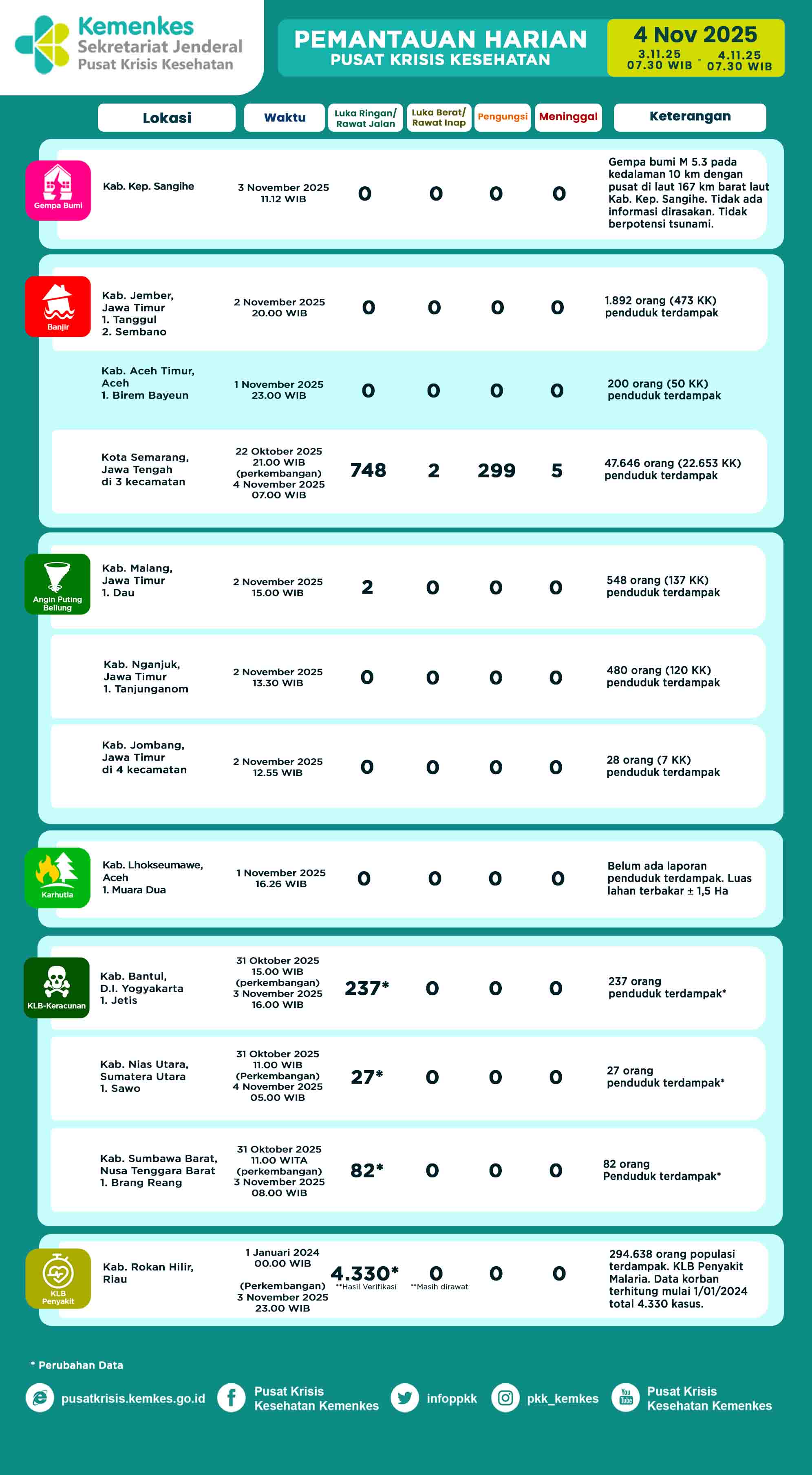 Di sini anda dapat melihat dan mengunduh laporan Pemantauan Harian Pusat Krisis Kesehatan Kementerian Kesehatan Tangga 15 Juni 2025 pukul 07.30 WIB hingga 16 Juni 2025 pukul 07.30 WIB.