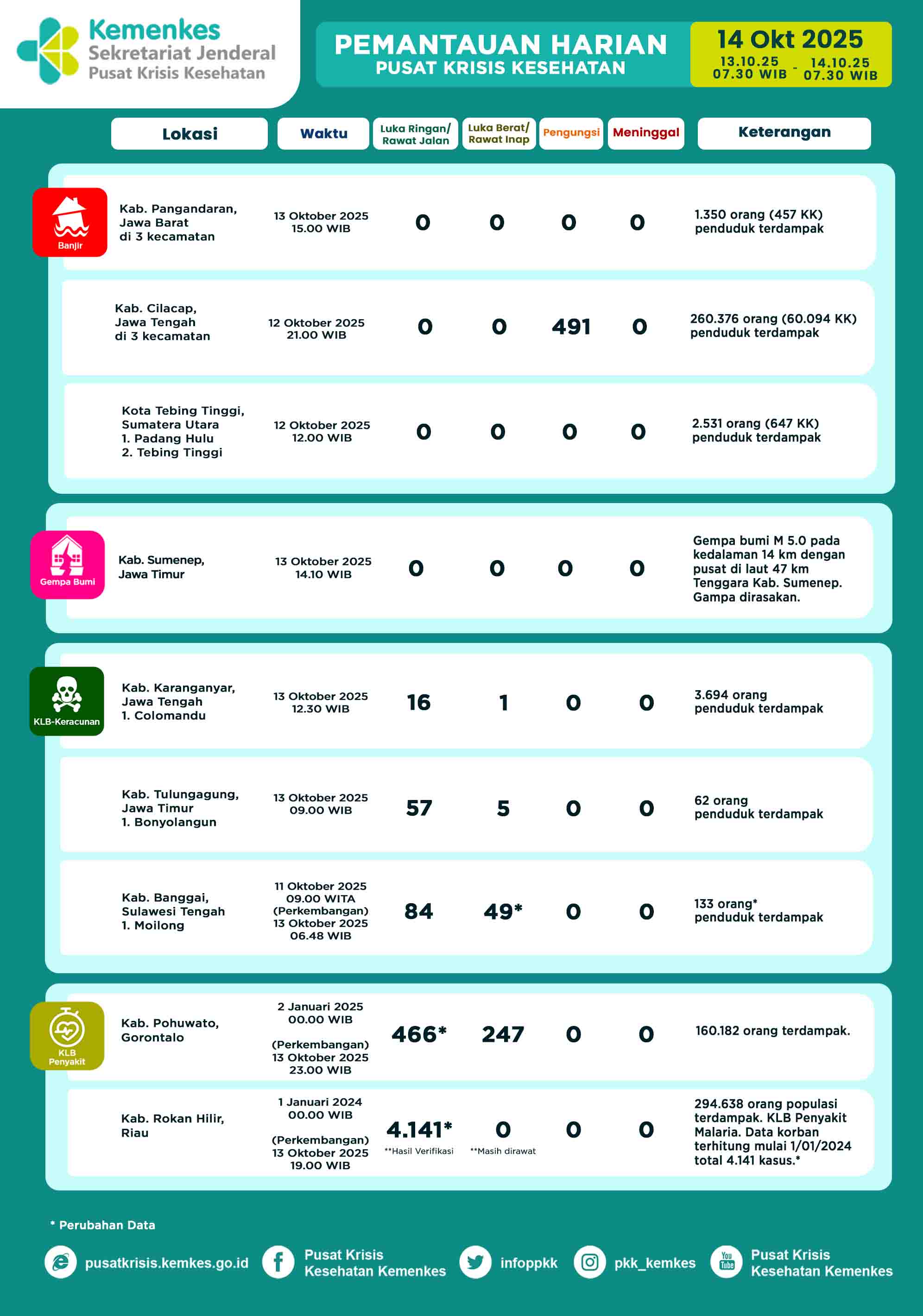 Disini anda dapat mengunduh Infografis Pemantauan Harian Kejadian Krisis Kesehatan Pusat Krisis Kesehatan Kementerian Kesehatan, tanggal 16 September 2021 pukul 07.30. Terdapat kejadian 3 banjir, 1 gempa bumi, 1 kebakaran, 1 tanah longsor, 1 kecelakaan transportasi udara, 3 angin puting beliung, 1 kecelakaan transportasi laut, dan 1 banjir dan tanah longsor
