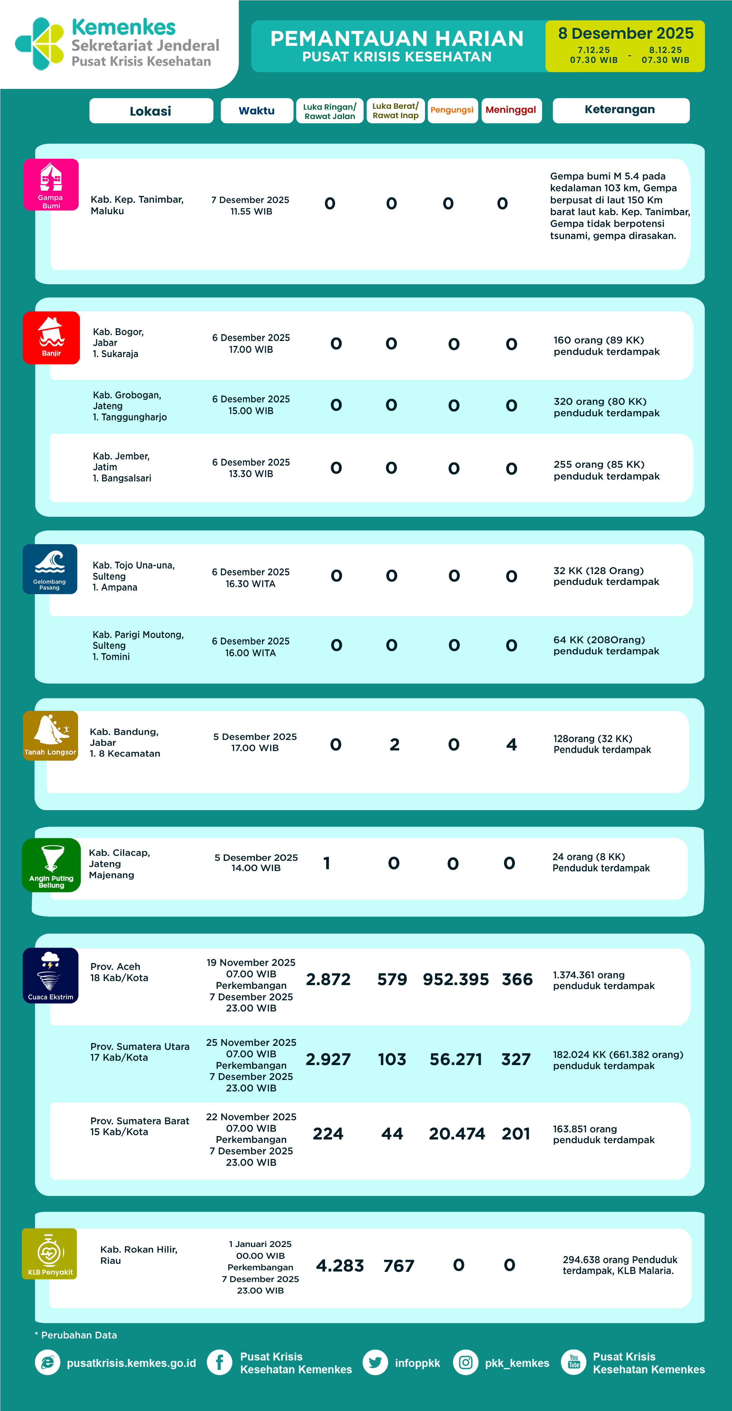 Disini anda dapat mengunduh Laporan Pemantauan Harian Kejadian Krisis Kesehatan Pusat Krisis Kesehatan Kementerian Kesehatan tanggal 17 Agustus 2023 pukul 07.30 WIB. Terdapat laporan kejadian: 3 Karhutla, 2 Kebakaran, 1 Kecelakaan Transportasi Laut, 1 Kecelakaan Transportasi Darat, 1 Kekeringan dan 1 Keracunan Makanan.