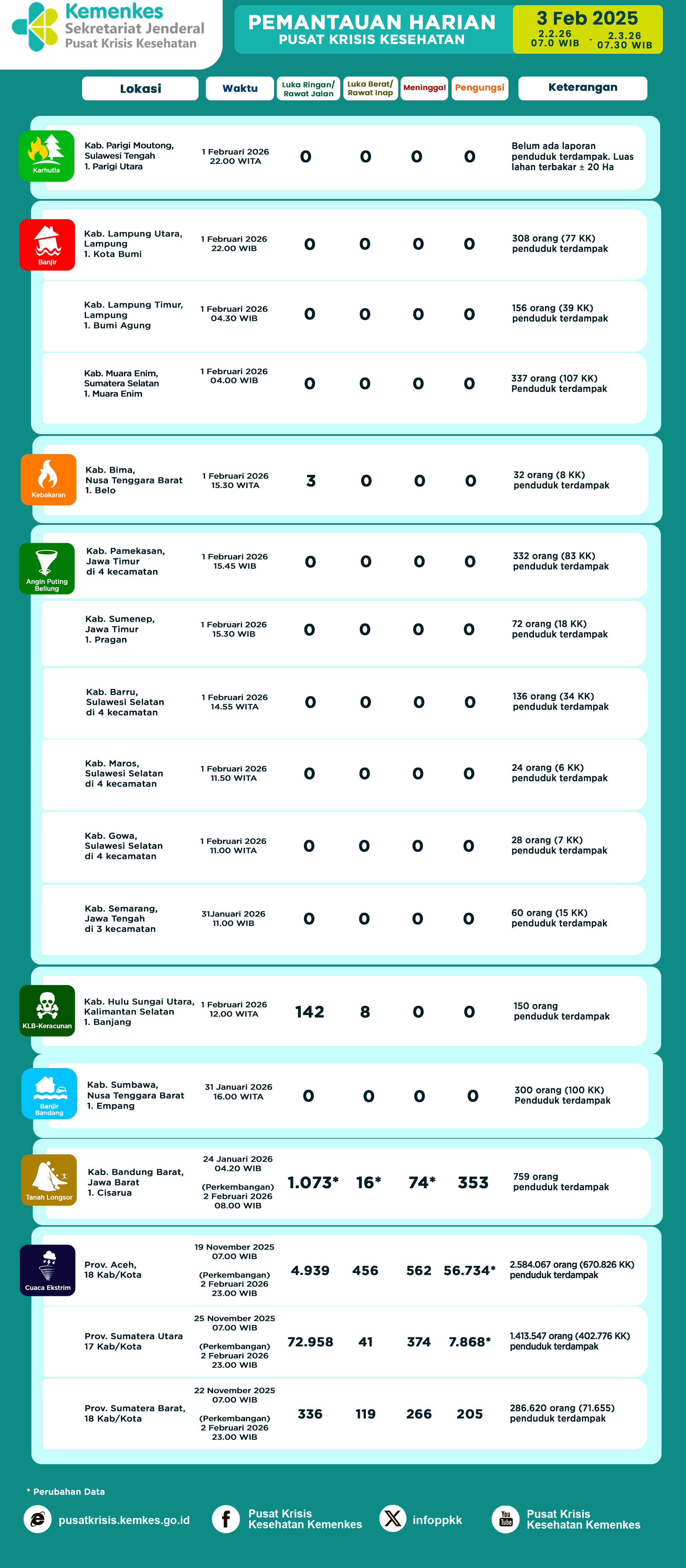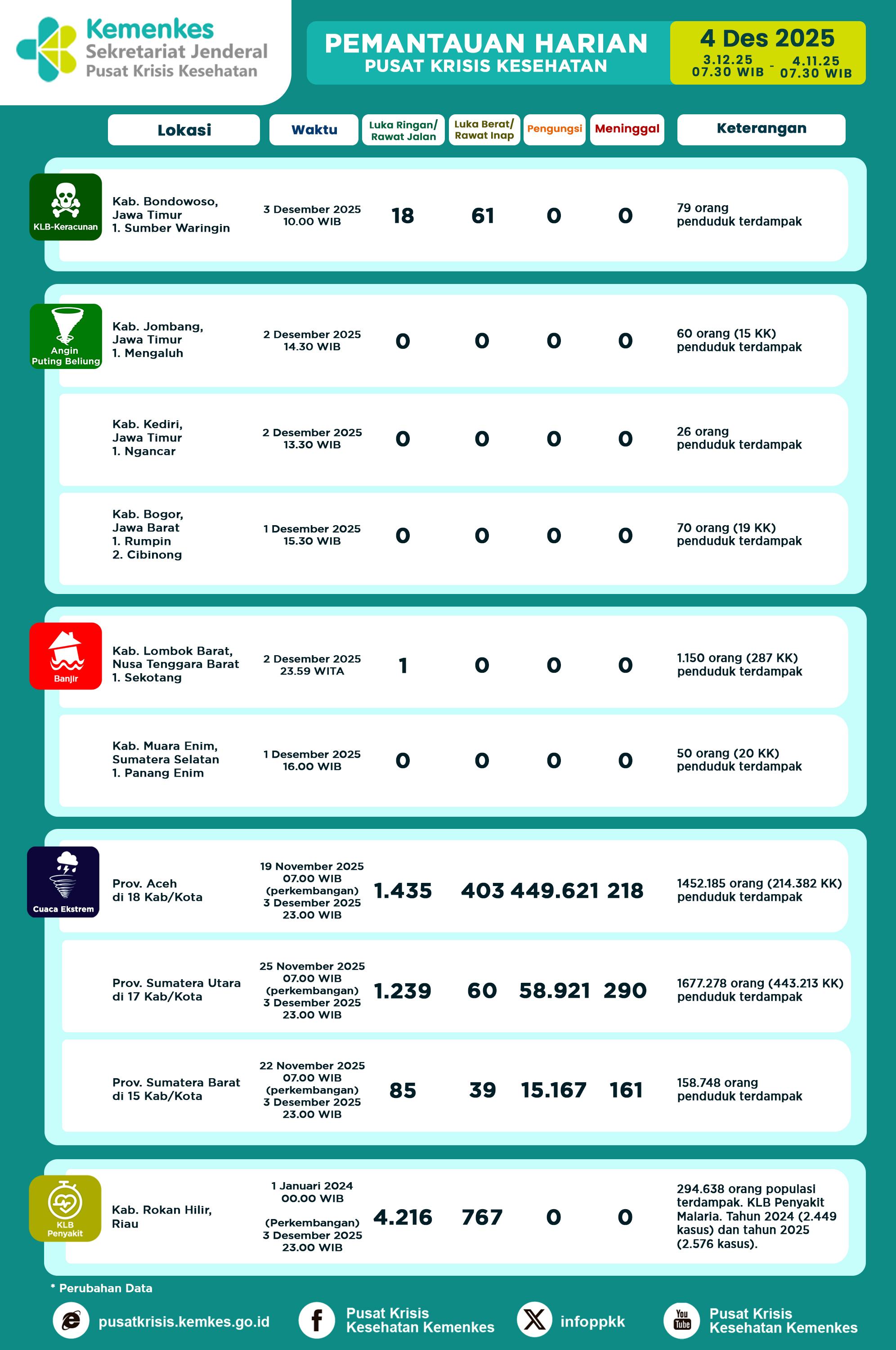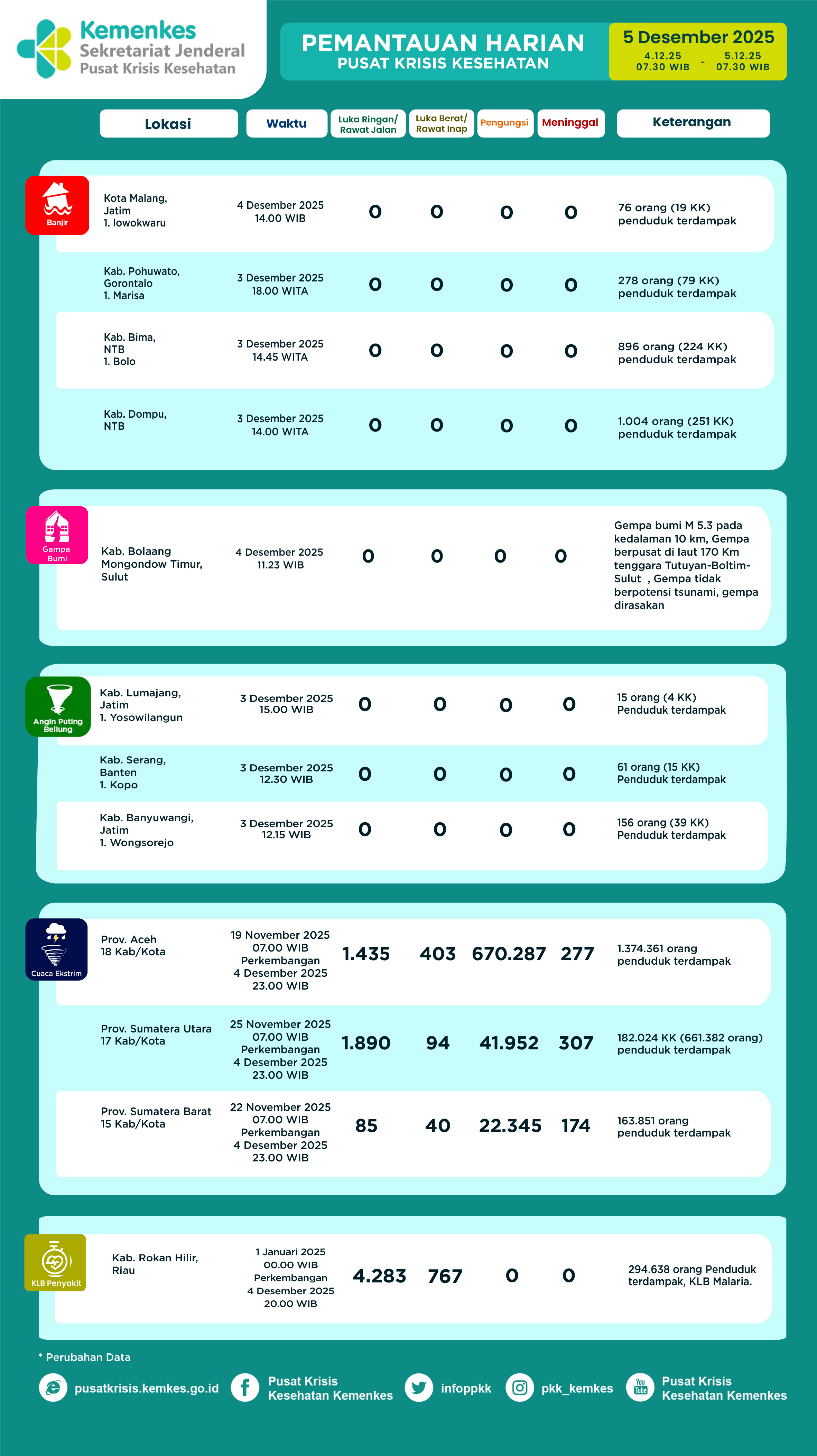 Disini anda dapat mengunduh Laporan Pemantauan Harian Kejadian Krisis Kesehatan Pusat Krisis Kesehatan Kementerian Kesehatan tanggal 16 Juli 2024 pukul 07.30 WIB hingga 17 Juli 2024 pukul 07.30 WIB. Terdapat 11 laporan kejadian bencana: 1 Karhutla, 1 Angin Puting Beliung, 4 Banjir, 1 Gempa Bumi, 1 Kebakaran, 1 Erupsi Gunung Api, 1 Keracunan, dan 1 Banjir dan Tanah Longsor.