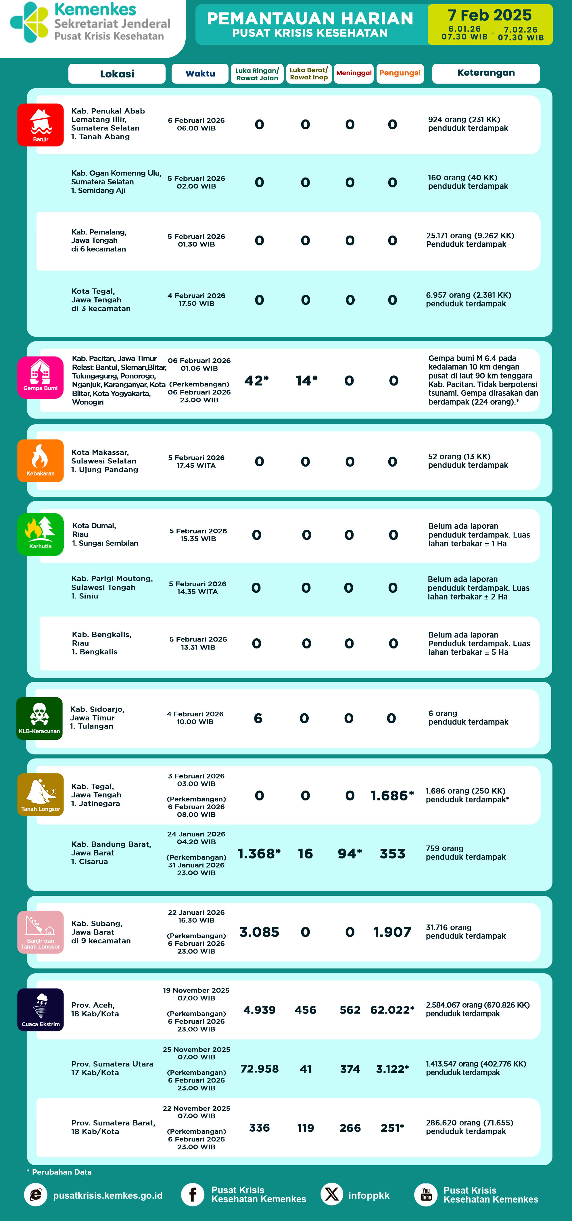 Di sini anda dapat melihat dan mengunduh laporan Pemantauan Harian Pusat Krisis Kesehatan Kementerian Kesehatan Tanggal 20 Juli 2025 pukul 07.30 WIB hingga 21 Juli 2025 pukul 07.30 WIB
