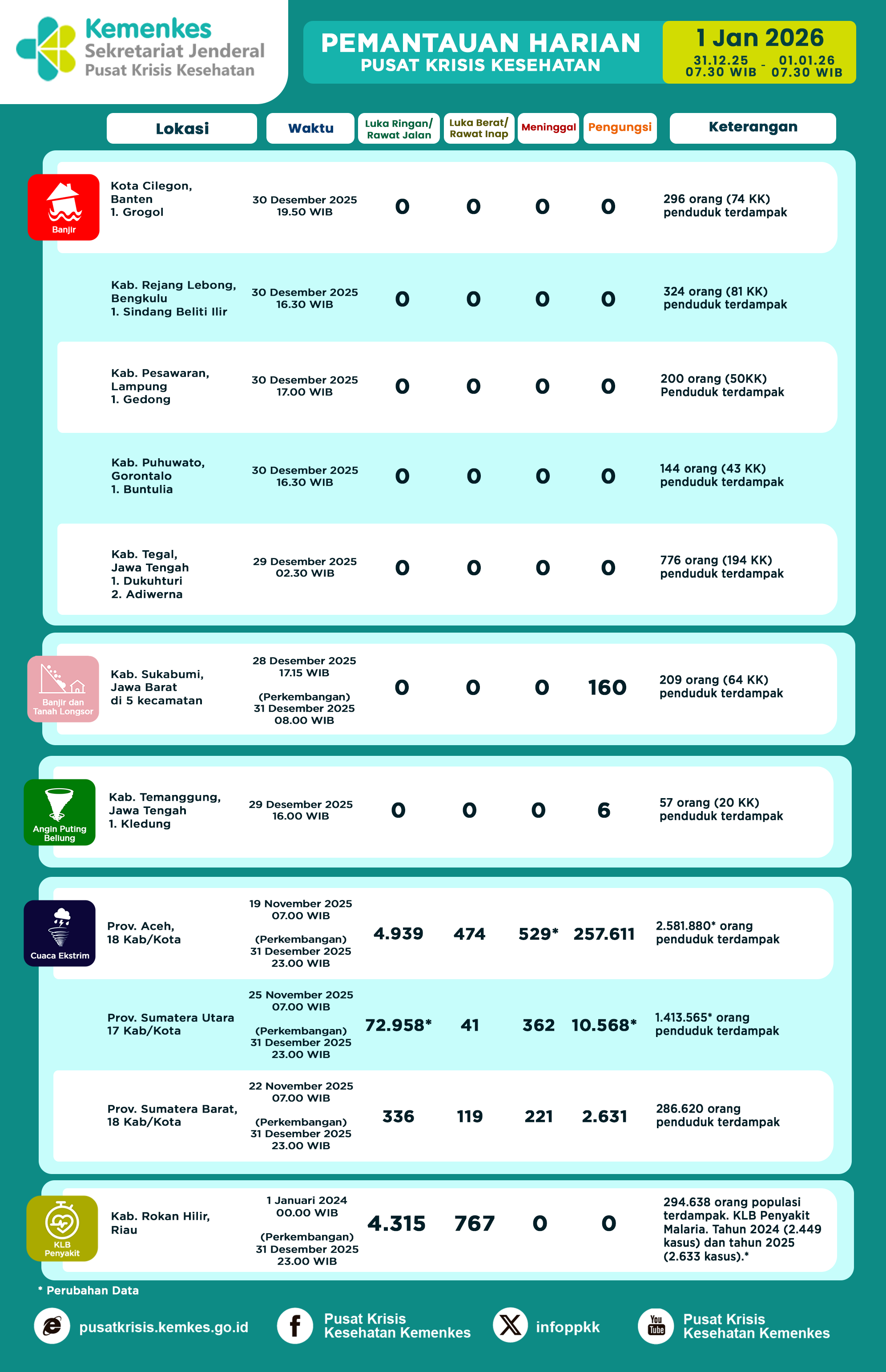 Disini anda dapat mengunduh Infografis Pemantauan Harian Kejadian Krisis Kesehatan Pusat Krisis Kesehatan Kementerian Kesehatan, tanggal 21 September 2021 pukul 07.30. Terdapat kejadian 1 banjir bandang, 3 karhutla, 3 kebakaran dan 1 kecelakaan transportasi laut.