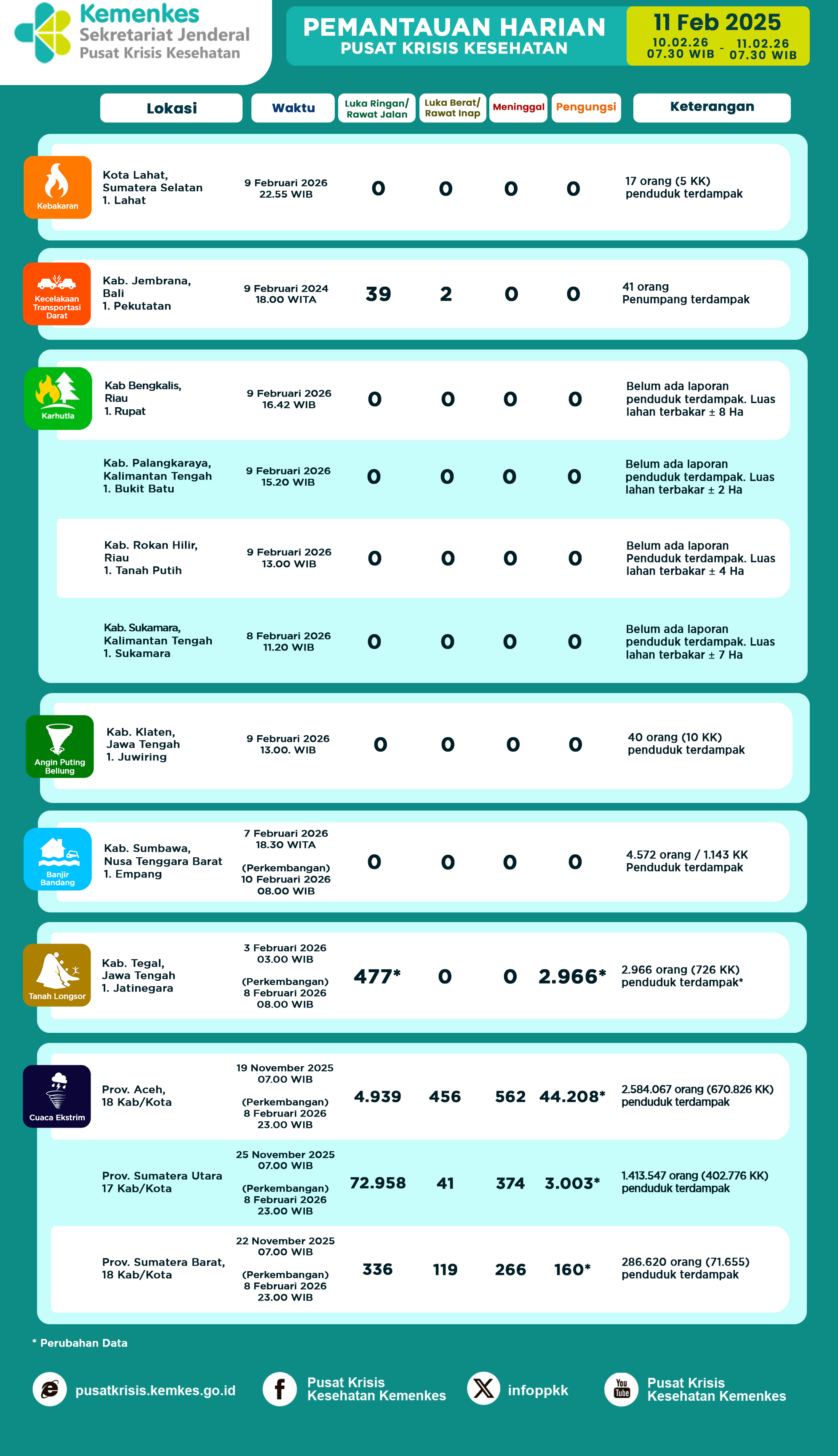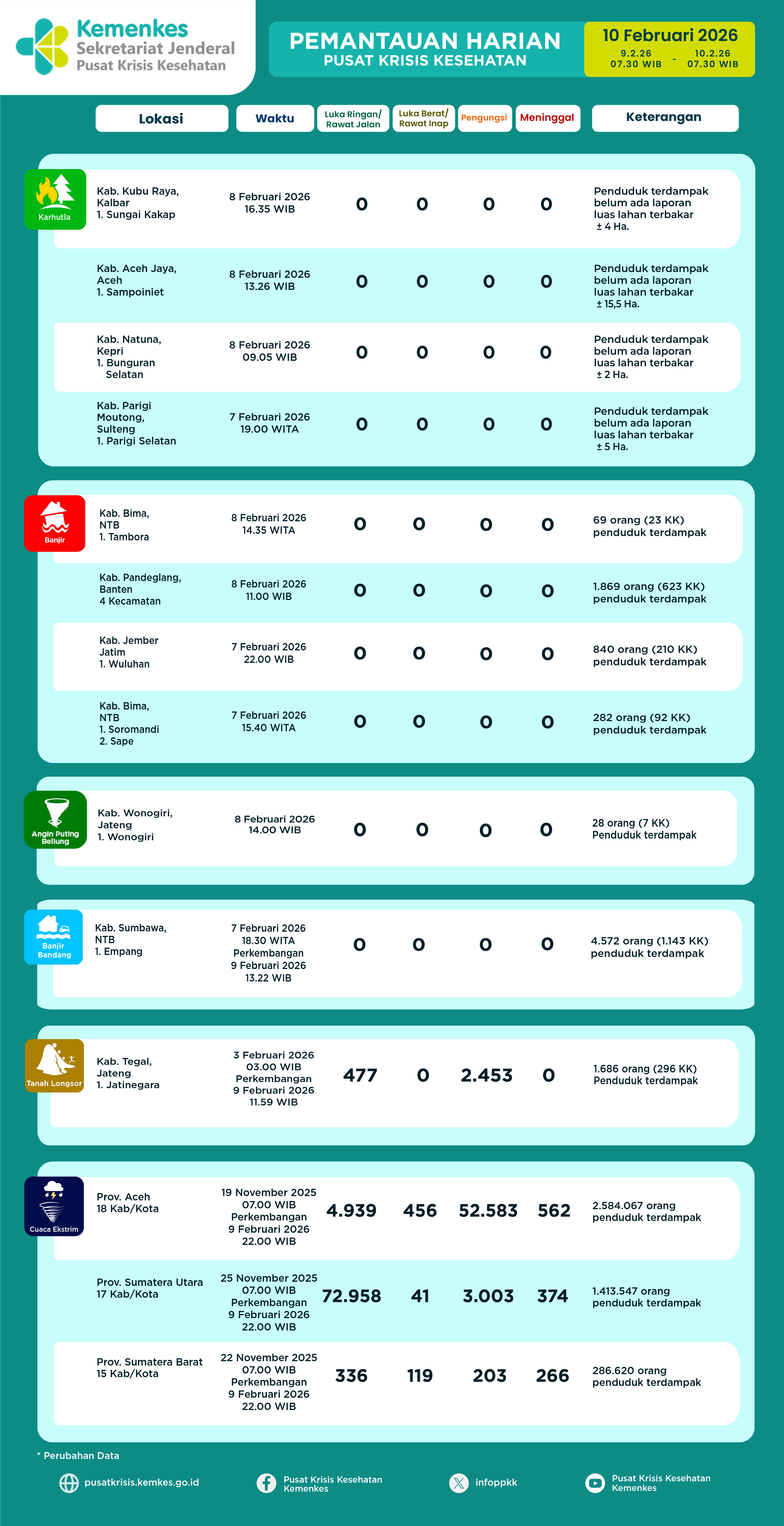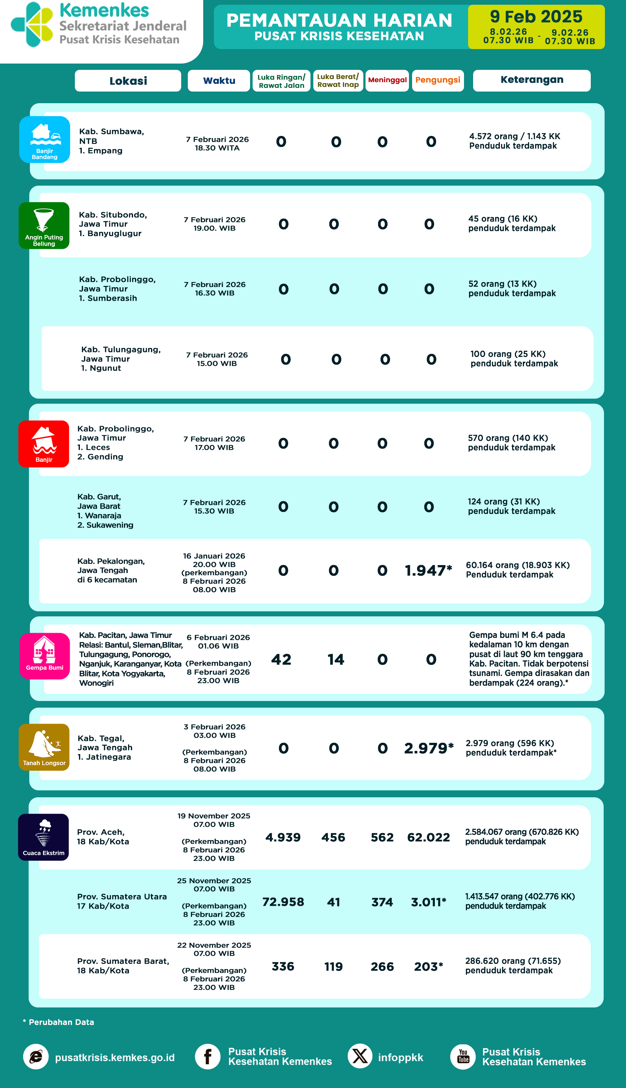 Disini anda dapat mengunduh Infografis Pemantauan Harian Kejadian Krisis Kesehatan Pusat Krisis Kesehatan Kementerian Kesehatan tanggal 22 Januari 2023 pukul 07.30 WIB. Terdapat laporan kejadian: 2 Gempa Bumi, 4 Banjir, 1 Kebakaran Hutan dan Lahan, 1 Kebakaran dan 1 Tanah Longsor