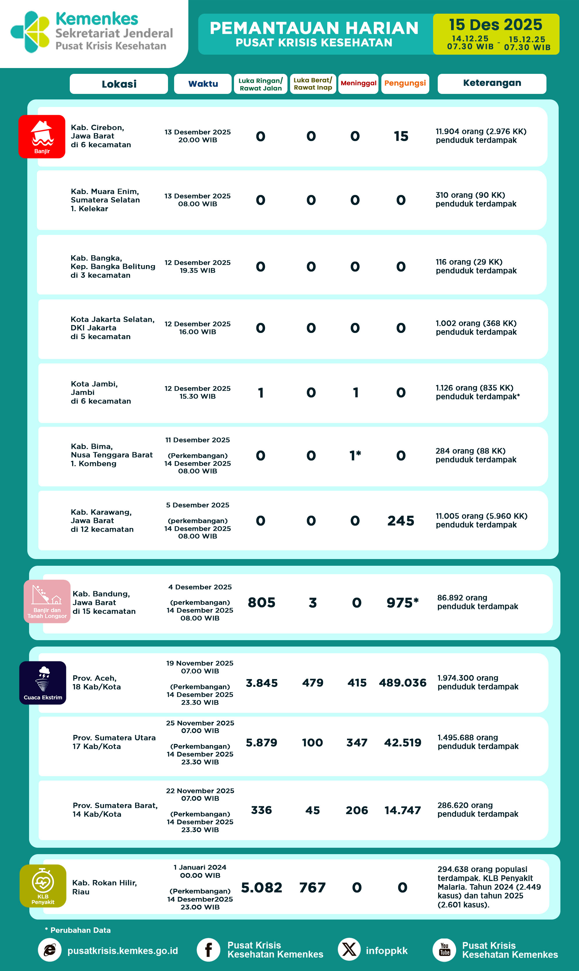 Disini anda dapat mengunduh Infografis Pemantauan Harian Kejadian Krisis Kesehatan Pusat Krisis Kesehatan Kementerian Kesehatan tanggal 22 September 2022 pukul 07.30 WIB. Terdapat laporan kejadian: 1 Gempa Bumi, 1 Banjir Bandang, 2 Banjir, 2 Karhutla, dan 2Angin Puting Beliung