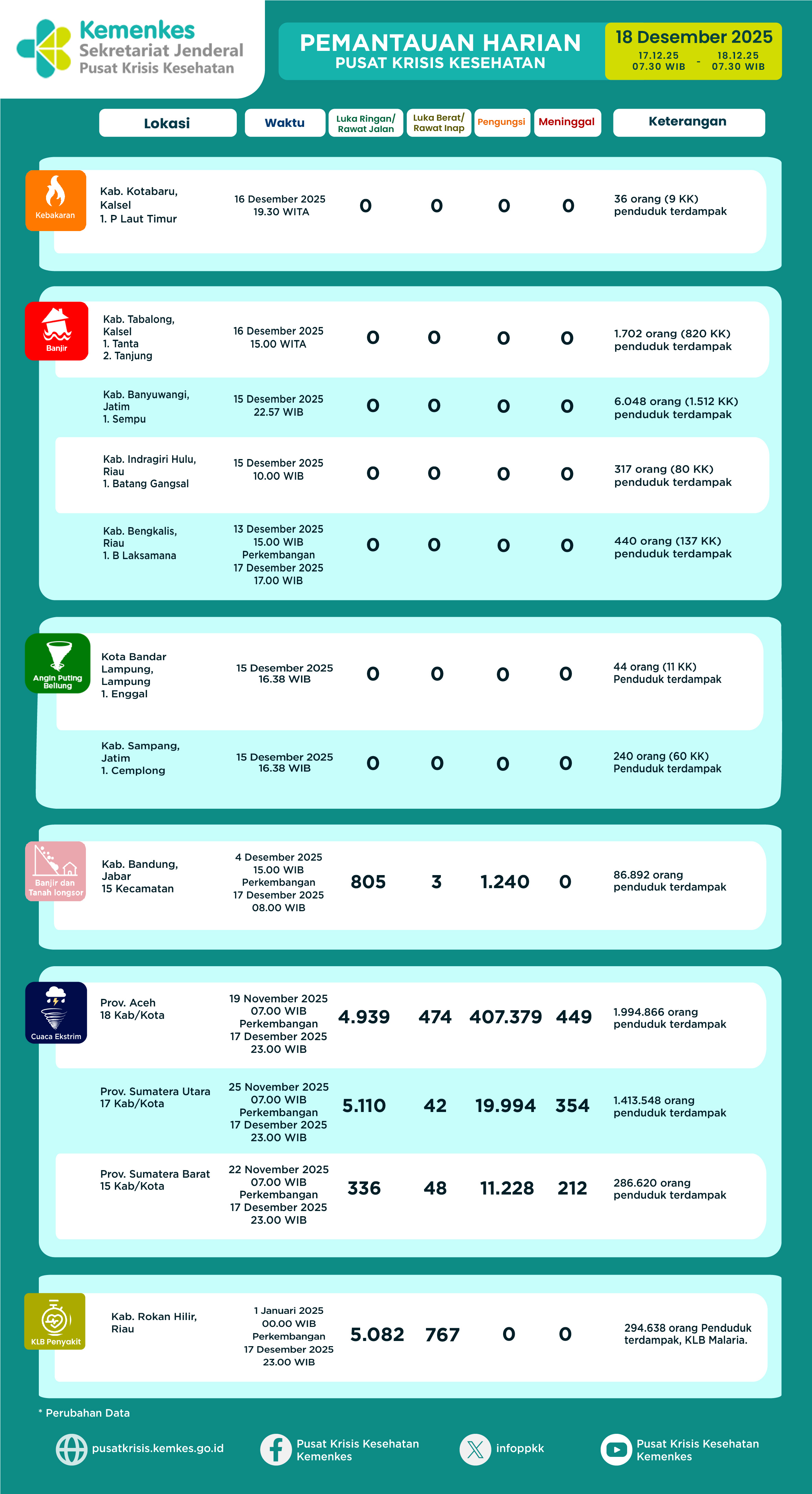 Di sini anda dapat melihat dan mengunduh laporan Pemantauan Harian Pusat Krisis Kesehatan Kementerian Kesehatan Tanggal 22 November 2025 pukul 07.30 WIB hingga 23 November 2025 pukul 07.30 WIB