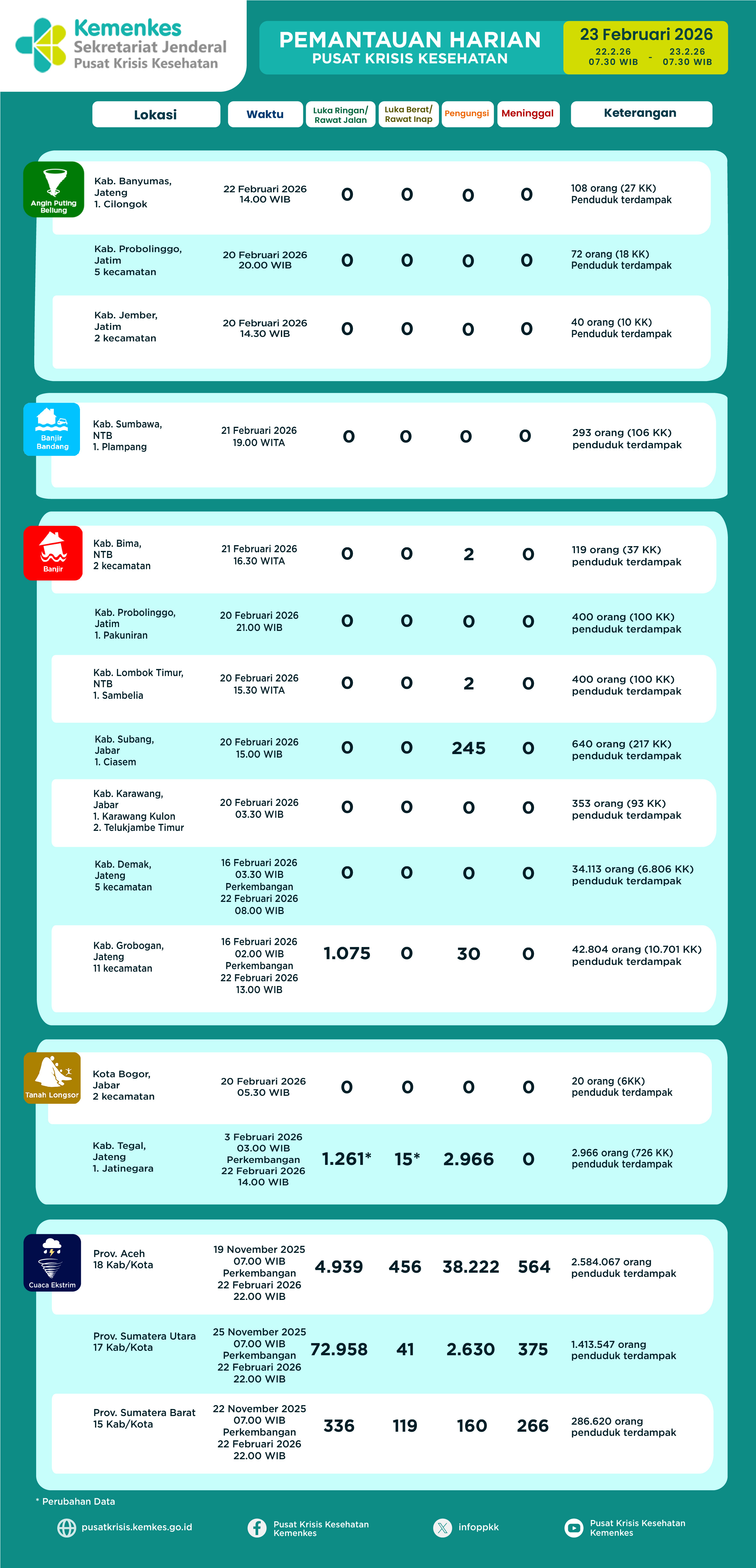 Disini anda dapat mengunduh Laporan Pemantauan Harian Kejadian Krisis Kesehatan Pusat Krisis Kesehatan Kementerian Kesehatan tanggal 23 Februari 2024 pukul 07.30 WIB hingga 24 Februari 2024 pukul 07.30 WIB. Terdapat 10 kejadian bencana: 1 Gempa Bumi, 3 Keracunan, 1 Banjir Bandang, 3 Angin Puting Beliung, 2 Banjir.