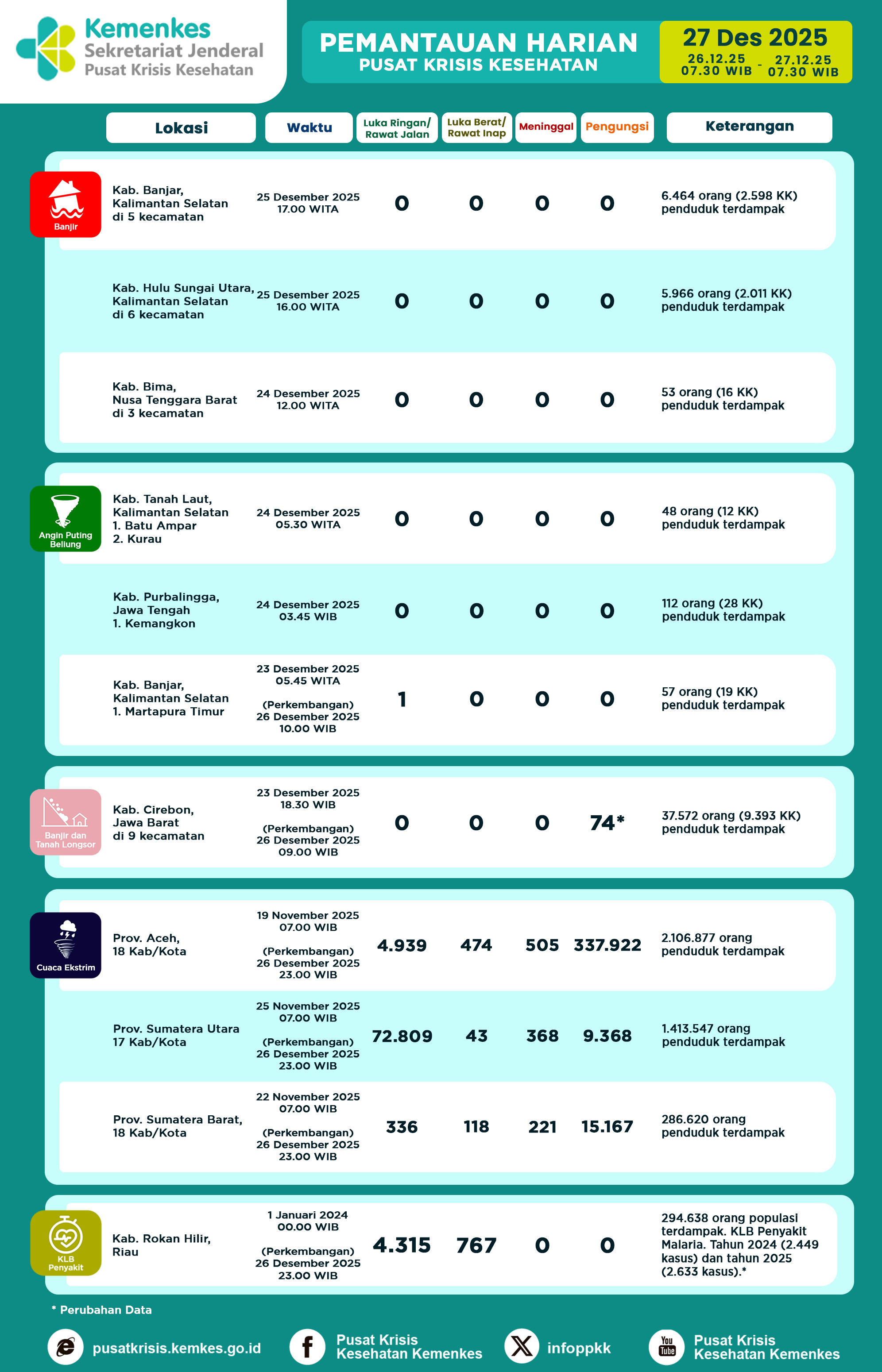 Disini anda dapat mengunduh Laporan Pemantauan Harian Kejadian Krisis Kesehatan Pusat Krisis Kesehatan Kementerian Kesehatan tanggal 23 Maret 2024 pukul 07.30 WIB hingga 24 Maret 2024 pukul 07.30 WIB. Terdapat 11 kejadian bencana: 4 Banjir, 2 Angin Puting Beliung, 1 Banjir dan Tanah Longsor, 2 Kebakaran dan 2 Gempa Bumi,