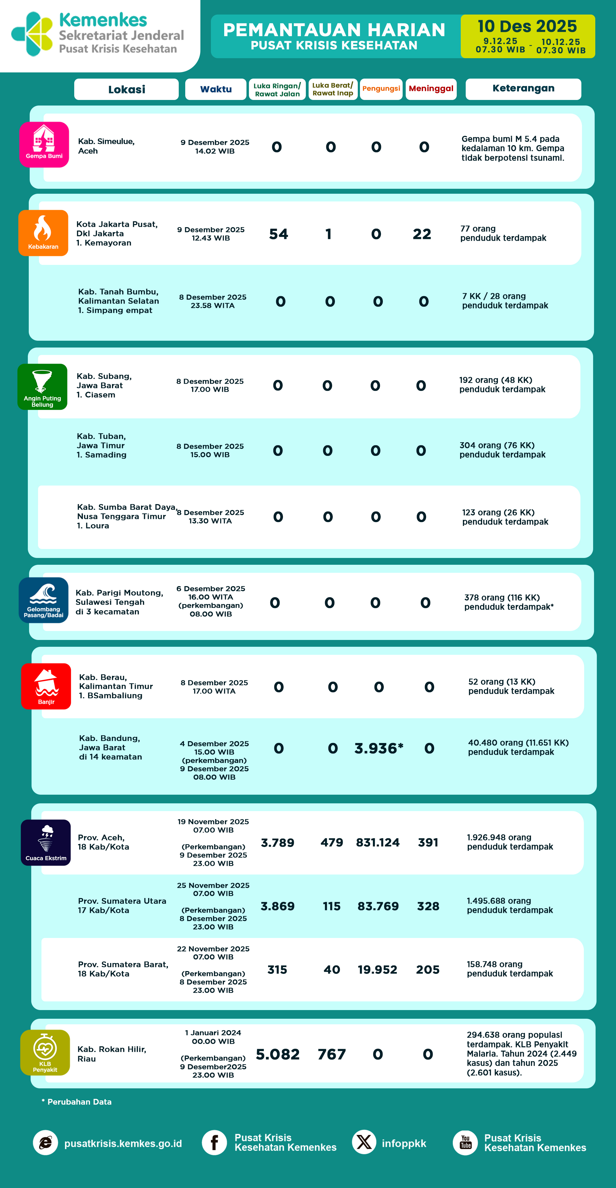 Disini anda dapat mengunduh Infografis Pemantauan Harian Kejadian Krisis Kesehatan Pusat Krisis Kesehatan Kementerian Kesehatan tanggal 25 Maret 2023 pukul 07.30 WIB. Terdapat laporan kejadian: 1 Erupsi Gunung Api, 1 Tanah Longsor, 5 Banjir dan 1 Angin Puting Beliung