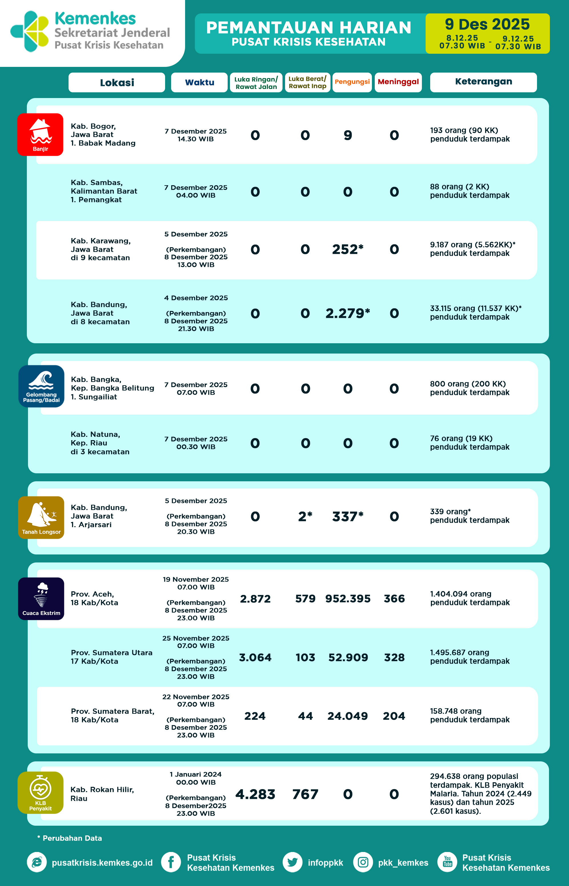 Disini anda dapat mengunduh Infografis Pemantauan Harian Kejadian Krisis Kesehatan Pusat Krisis Kesehatan Kementerian Kesehatan tanggal 26 Mei 2023 pukul 07.30 WIB. Terdapat laporan kejadian: 4 Karhutla, 2 Kebakaran, 1 Banjir dan Tanah Longsor,1 Banjir