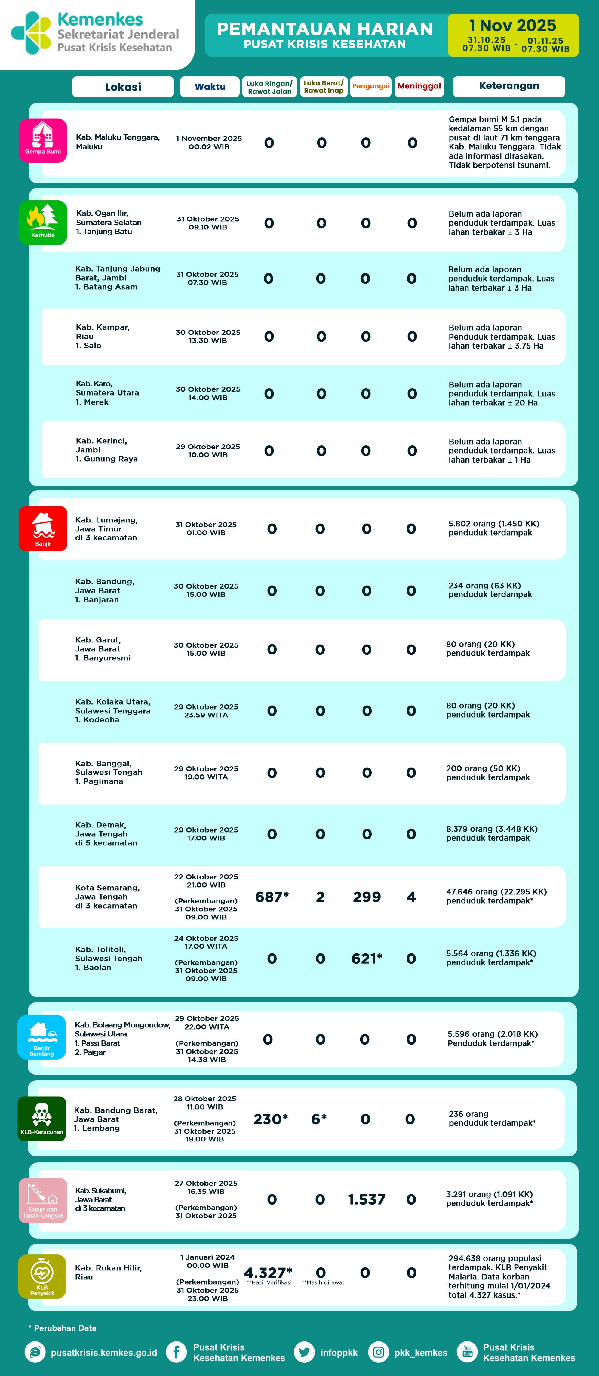 Disini anda dapat mengunduh Infografis Pemantauan Harian Kejadian Krisis Kesehatan Pusat Krisis Kesehatan Kementerian Kesehatan, tanggal 27 Juli 2021 pukul 07.30. Terdapat kejadian 5 kebakaran hutan dan lahan, 3 kebakaran, 1 gempa bumi dan 1 tanah longsor.