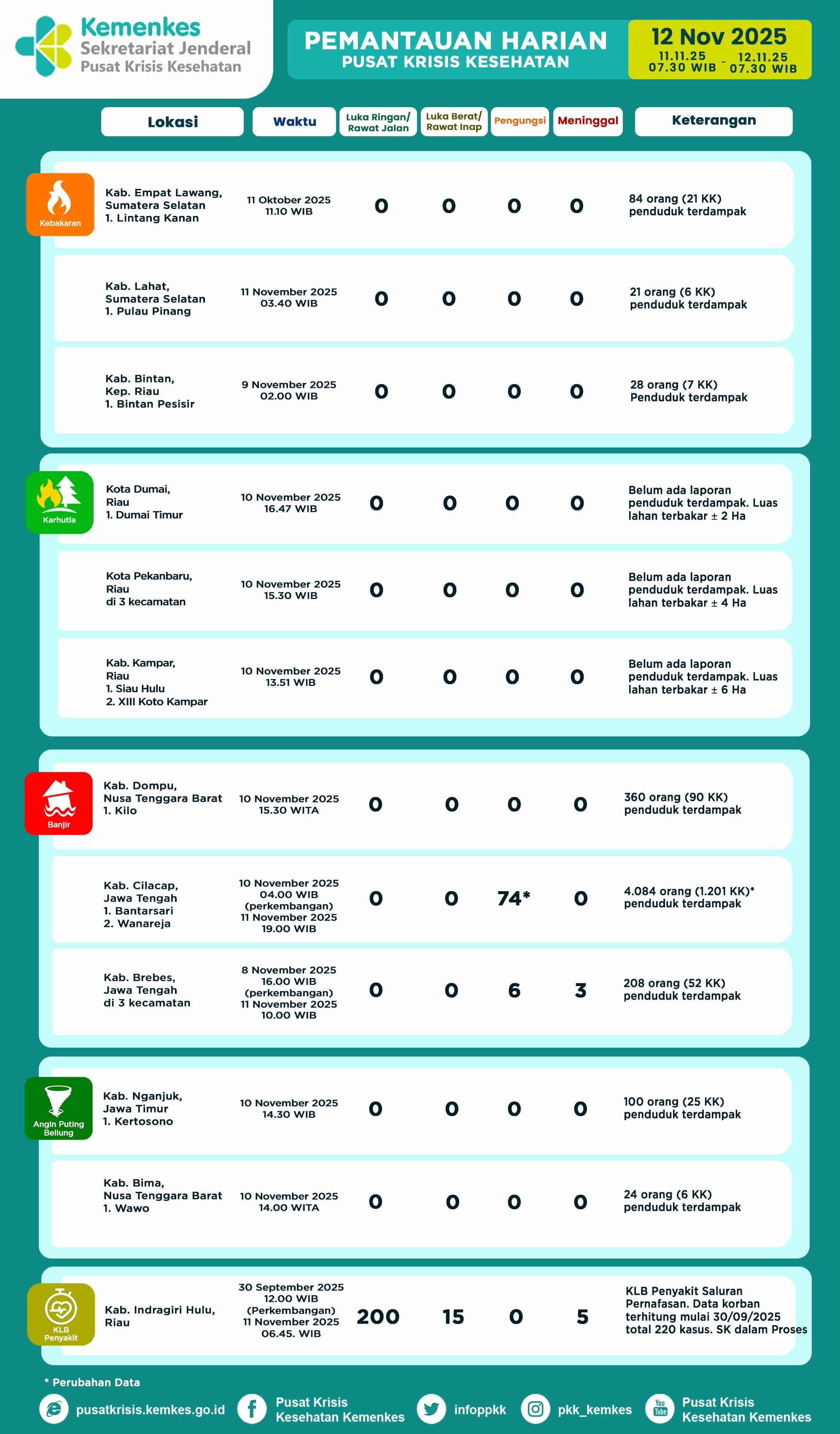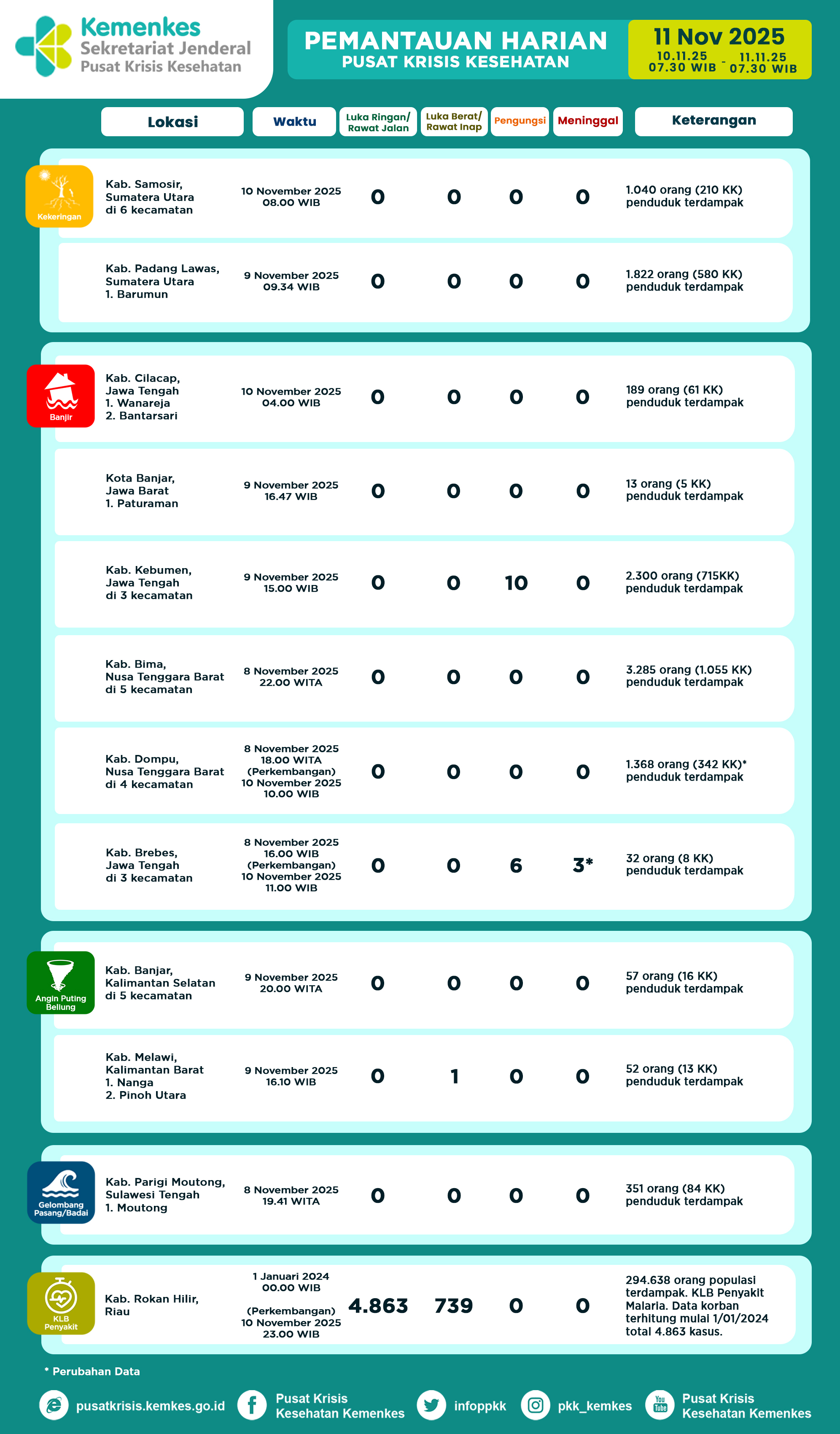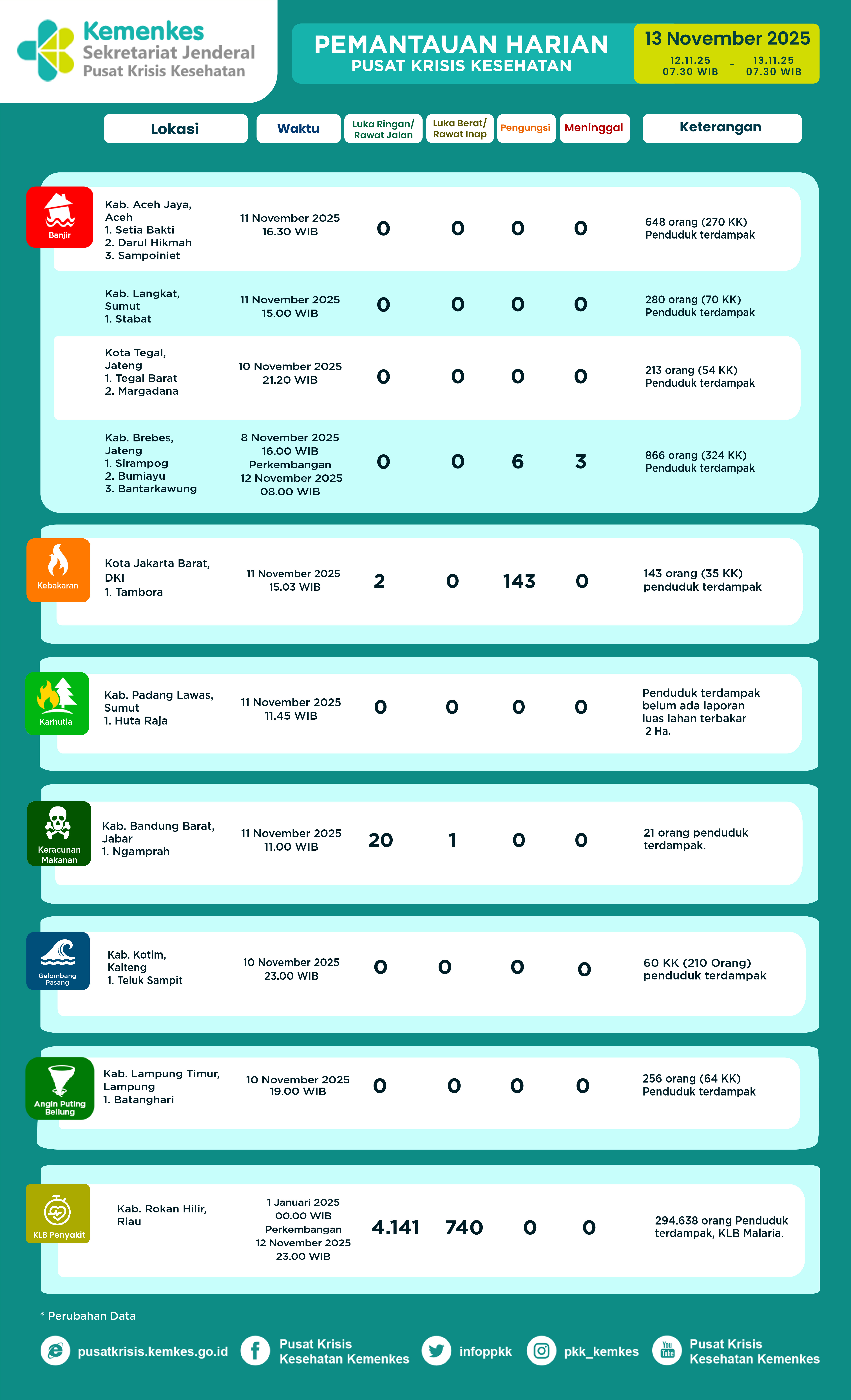 Di sini anda dapat melihat dan mengunduh laporan Pemantauan Harian Pusat Krisis Kesehatan Kementerian Kesehatan Tangga 26 Juni 2025 pukul 07.30 WIB hingga 27 Juni 2025 pukul 07.30 WIB