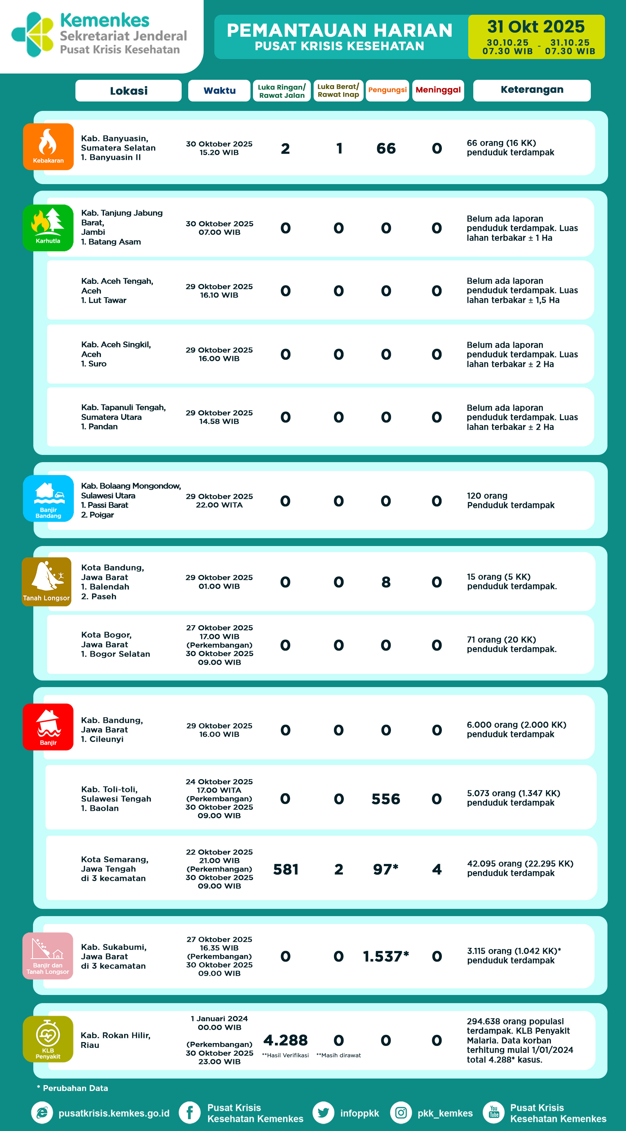Disini anda dapat mengunduh Laporan Pemantauan Harian Kejadian Krisis Kesehatan Pusat Krisis Kesehatan Kementerian Kesehatan tanggal 27 Januari 2024 pukul 07.30 WIB hingga 28 Januari 2024 pukul 07.30 WIB. Terdapat 11 kejadian bencana: 1 Gempa Bumi, 1 Tanah Longsor, 4 Banjir, 2 Banjir Bandang, 2 Angin Puting Beliung, 1 Erupsi Gunung Api.