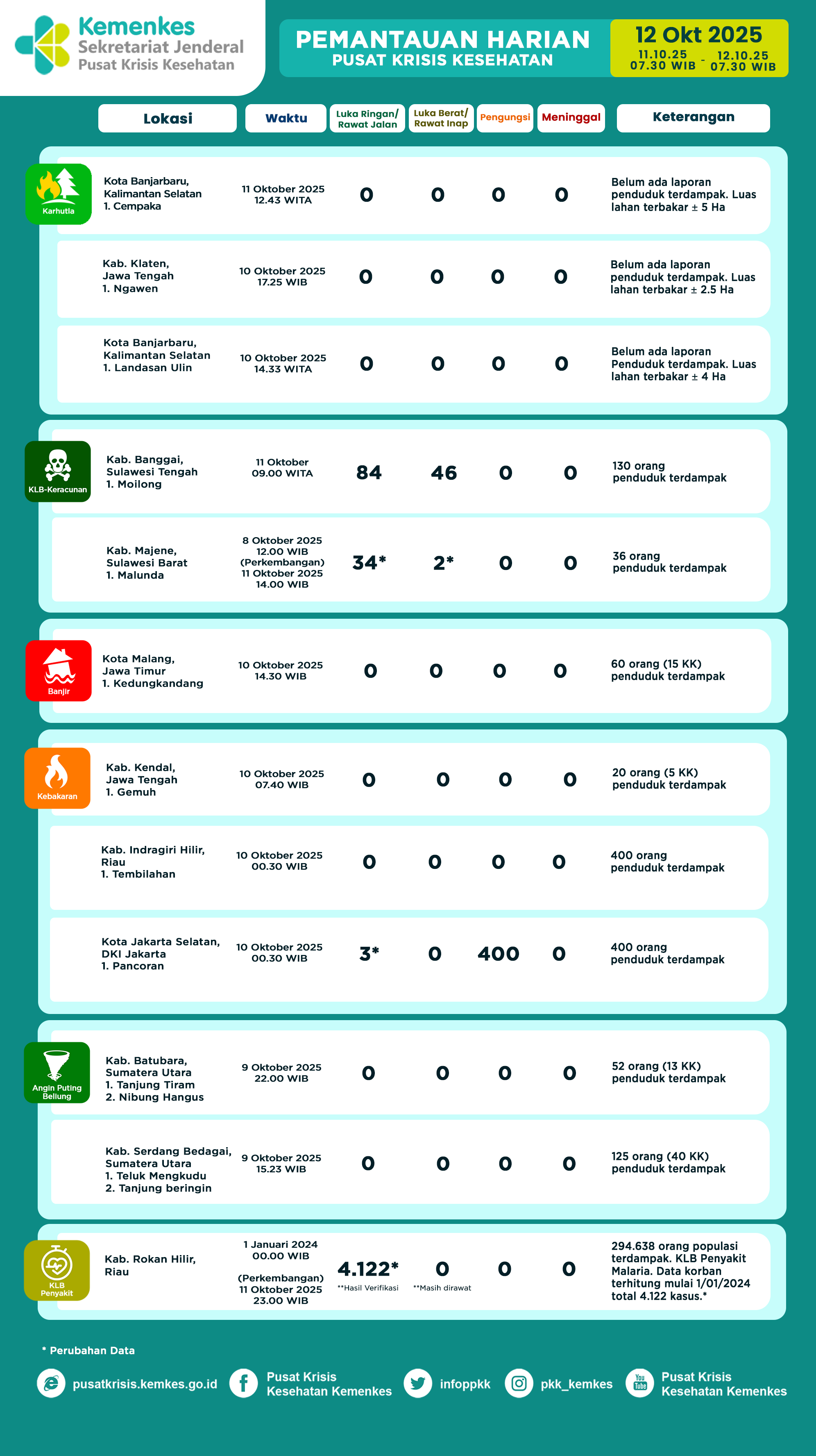 Disini anda dapat mengunduh Laporan Pemantauan Harian Kejadian Krisis Kesehatan Pusat Krisis Kesehatan Kementerian Kesehatan tanggal 27 Juli 2024 pukul 07.30 WIB hingga 28 Juli 2024 pukul 07.30 WIB. Terdapat 10 laporan kejadian bencana: 1 Kebakaran, 6 kebakaran hutan dan lahan, 1 banjir, 1 erupsi gunung api, dan 1 banjir dan tanah longsor