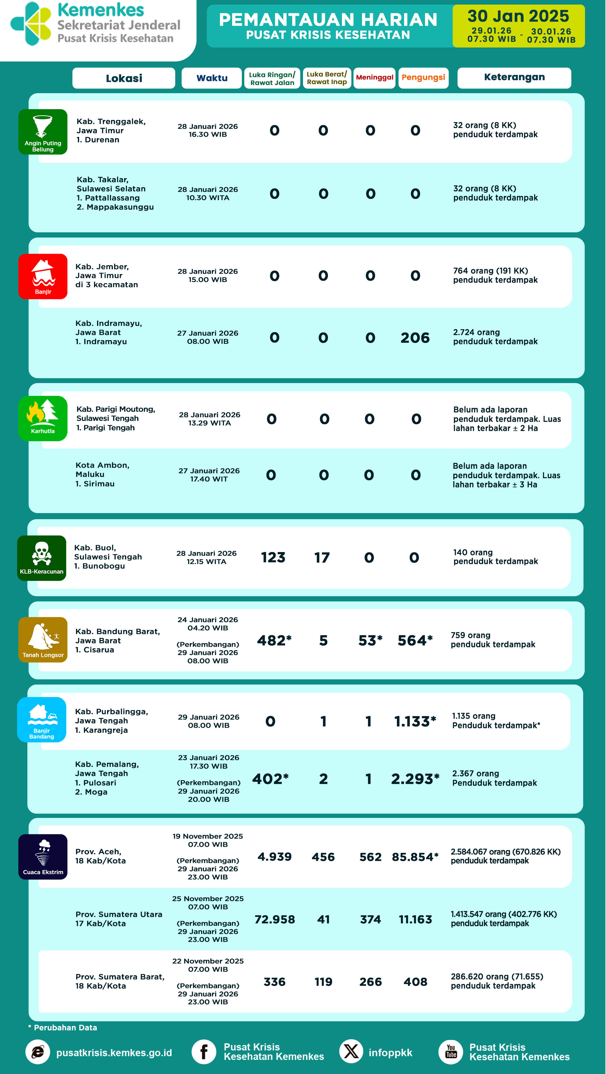 Di sini anda dapat melihat dan mengunduh laporan Pemantauan Harian Pusat Krisis Kesehatan Kementerian Kesehatan Tanggal 27 September 2025 pukul 07.30 WIB hingga 28 September 2025 pukul 07.30 WIB