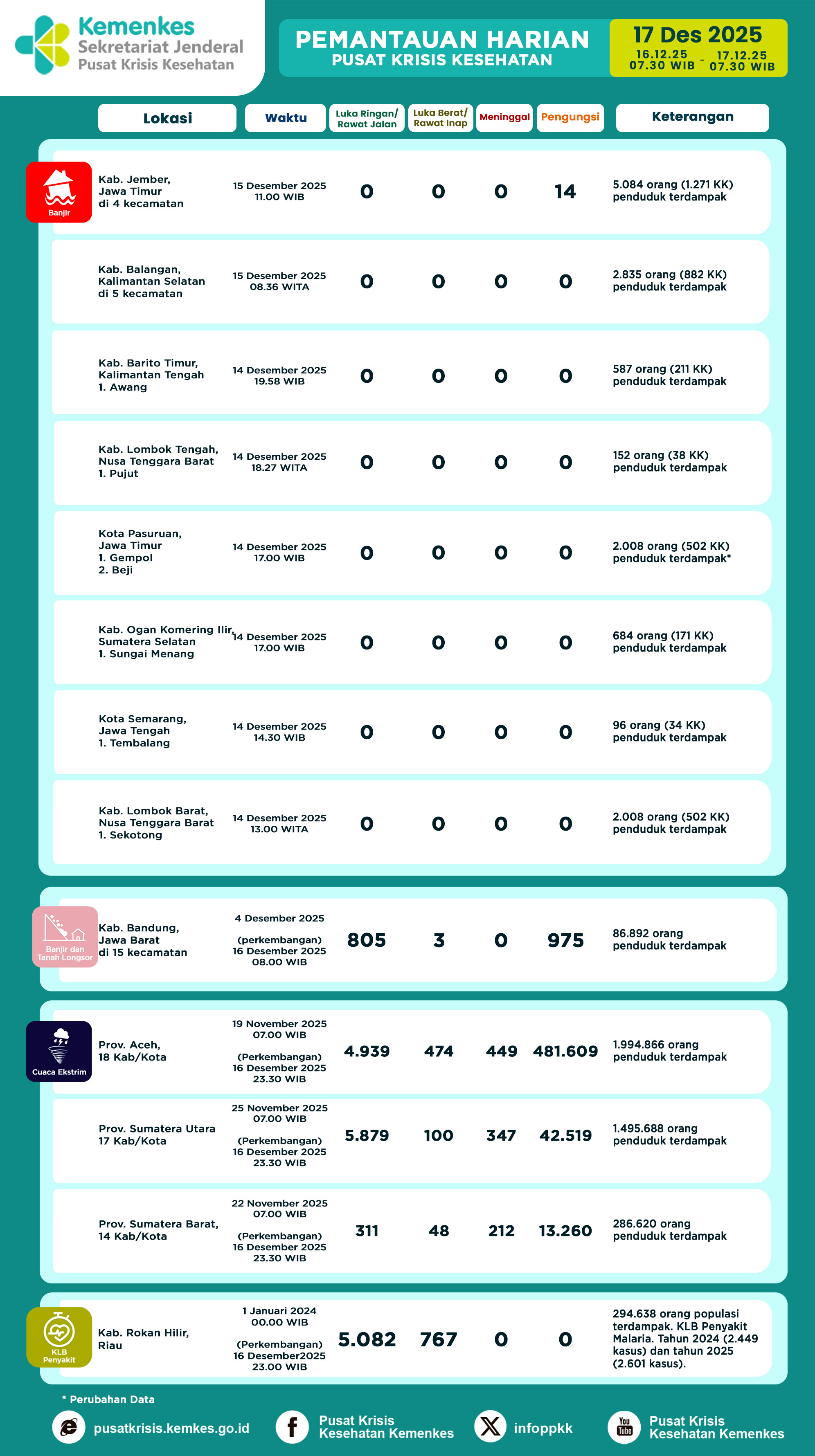 Disini anda dapat mengunduh Infografis Pemantauan Harian Kejadian Krisis Kesehatan Pusat Krisis Kesehatan Kementerian Kesehatan tanggal 29 Maret 2023 pukul 07.30 WIB. Terdapat laporan kejadian: 3 Angin Puting Beliung, 1 Gempa Bumi, 4 Banjir, 1 Keracunan Makanan dan 1 Tanah Longsor