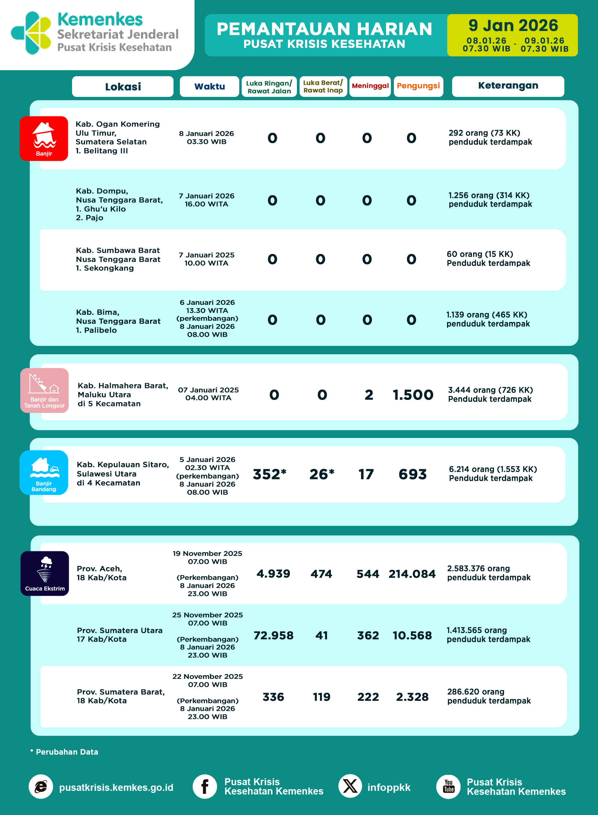 Di sini anda dapat melihat dan mengunduh laporan Pemantauan Harian Pusat Krisis Kesehatan Kementerian Kesehatan Tanggal 7 Januari 2026 pukul 07.30 WIB hingga 8 Januari 2026 pukul 07.30 WIB