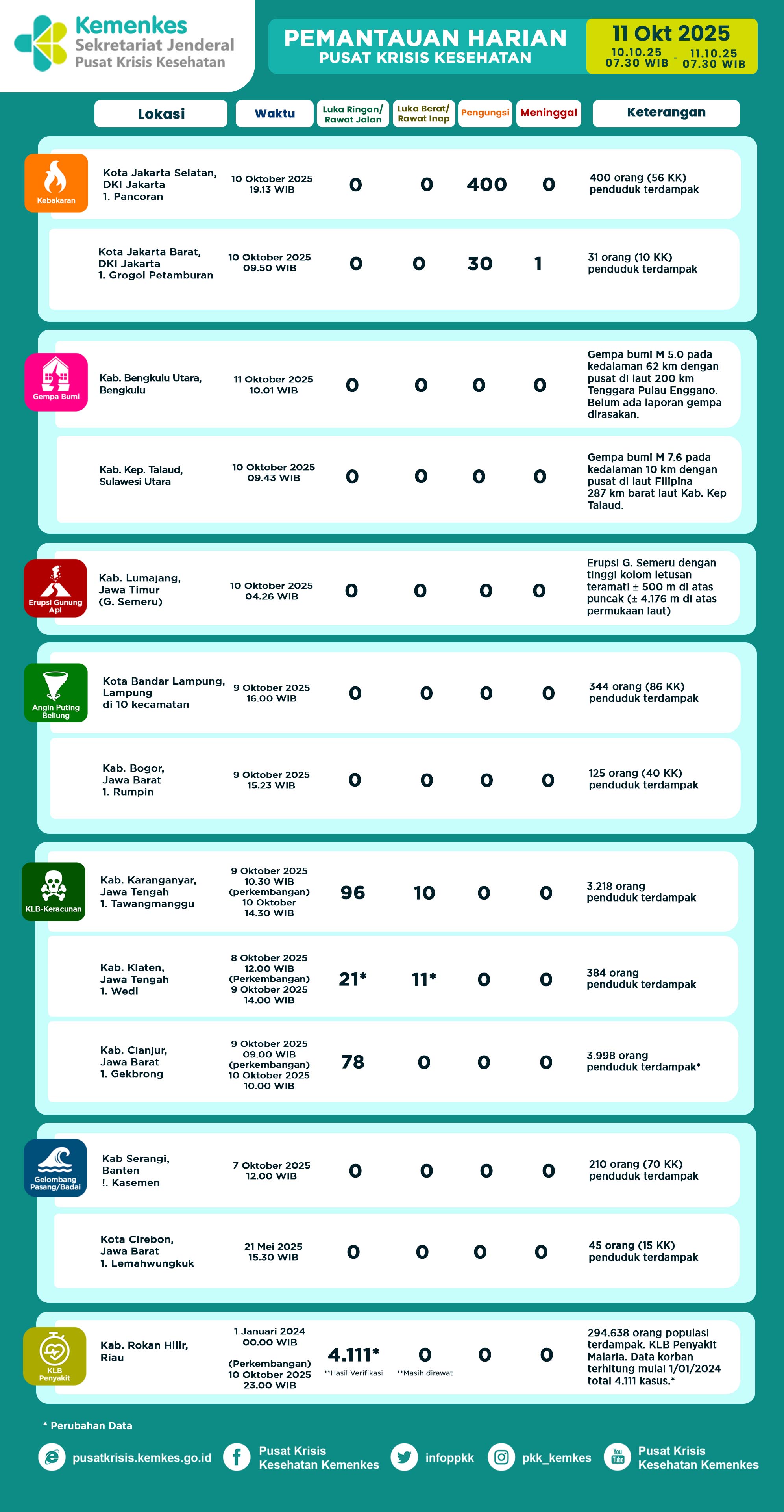 Disini anda dapat melihat dan mengunduh Laporan Pemantauan Harian Kejadian Krisis Kesehatan Pusat Krisis Kesehatan Kementerian Kesehatan tanggal 8 Mei 2025 pukul 07.30 WIB hingga 9 Mei 2025 pukul 07.30 WIB