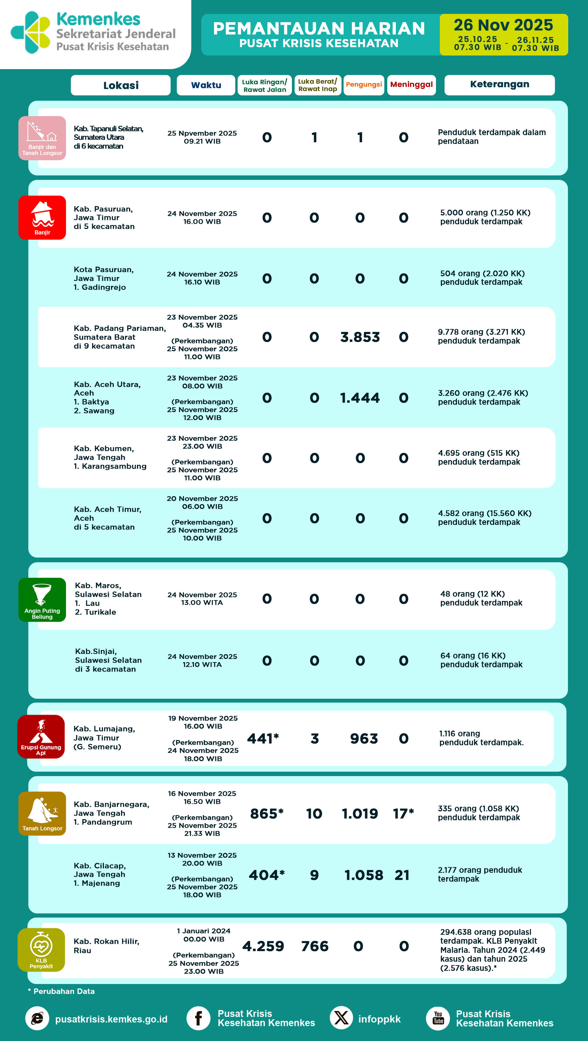 Di sini anda dapat melihat dan mengunduh laporan Pemantauan Harian Pusat Krisis Kesehatan Kementerian Kesehatan Tanggal 25 November 2025 pukul 07.30 WIB hingga 26 November 2025 pukul 07.30 WIB..
