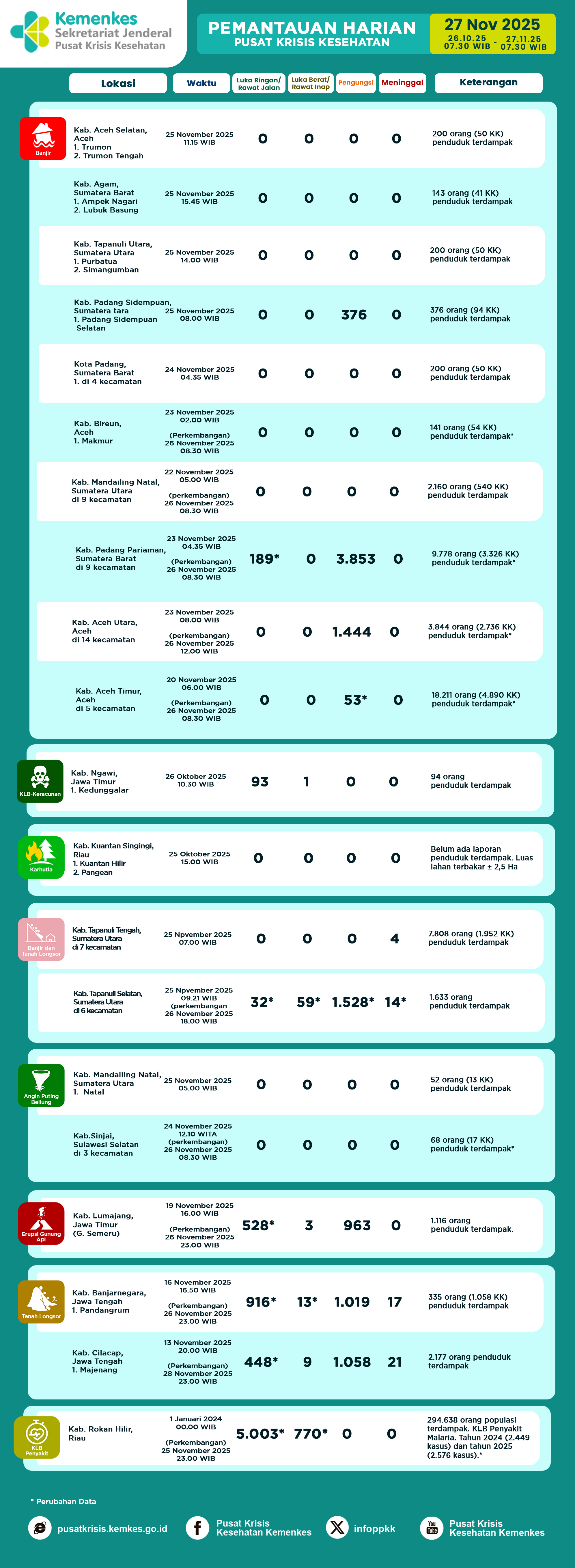 Di sini anda dapat melihat dan mengunduh laporan Pemantauan Harian Pusat Krisis Kesehatan Kementerian Kesehatan Tanggal 26 November 2025 pukul 07.30 WIB hingga 27 November 2025 pukul 07.30 WIB..